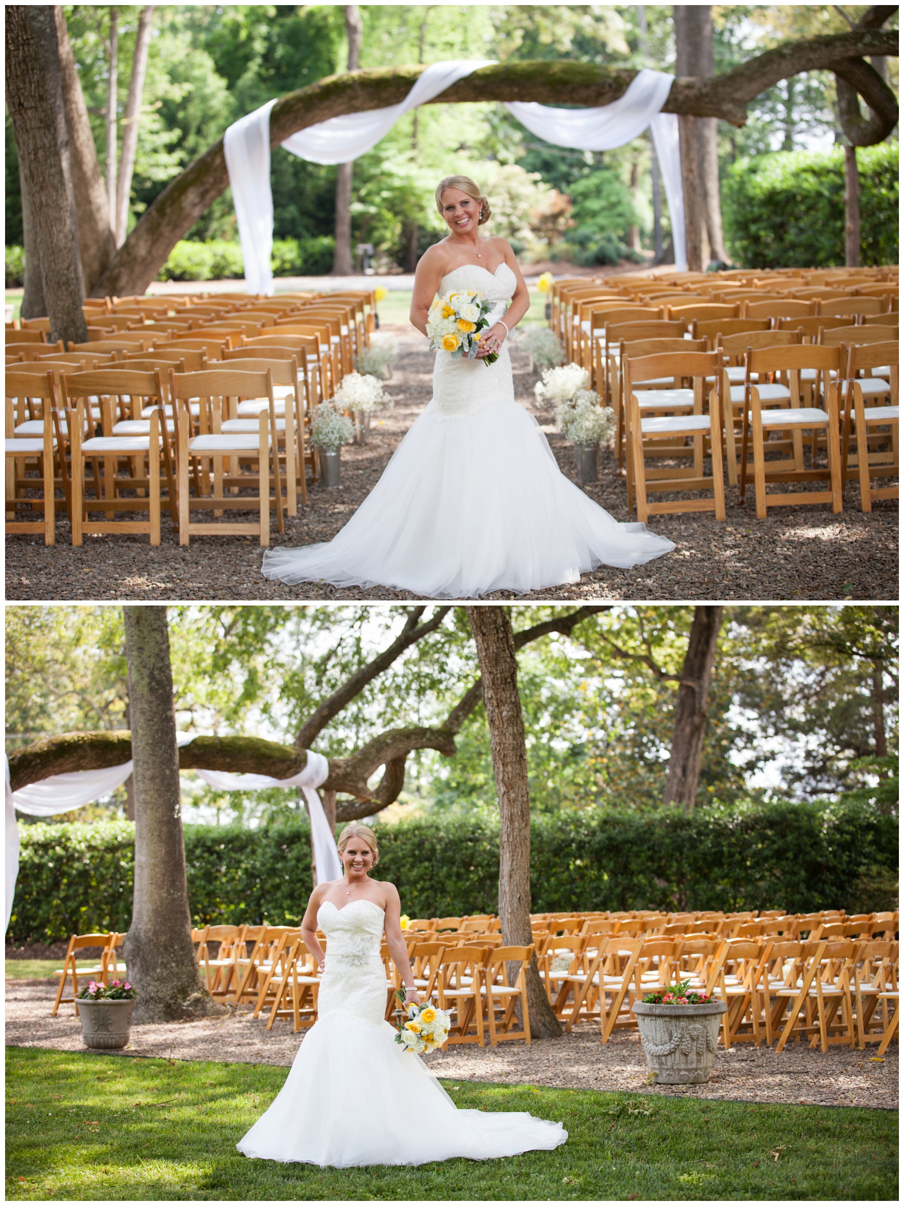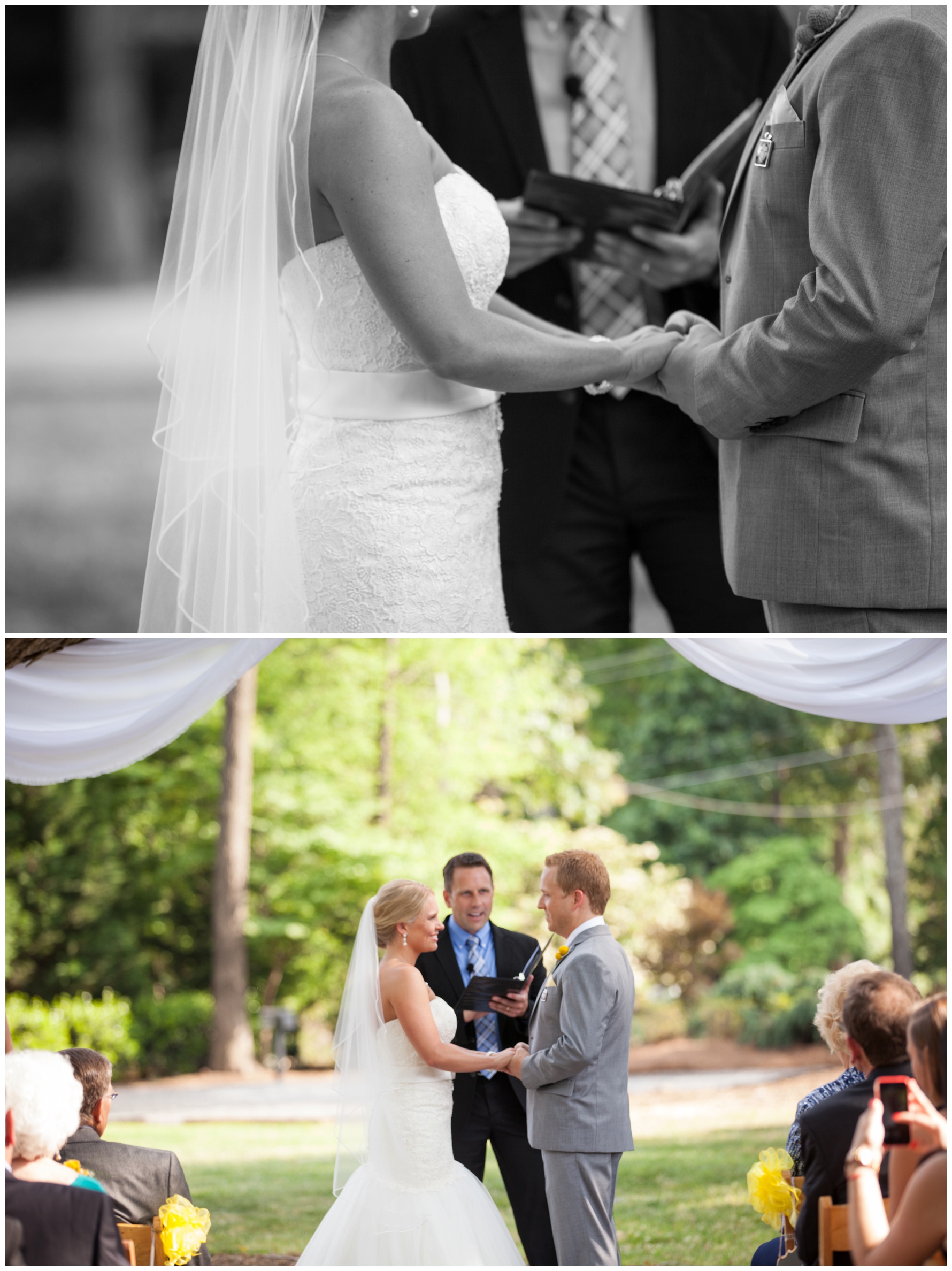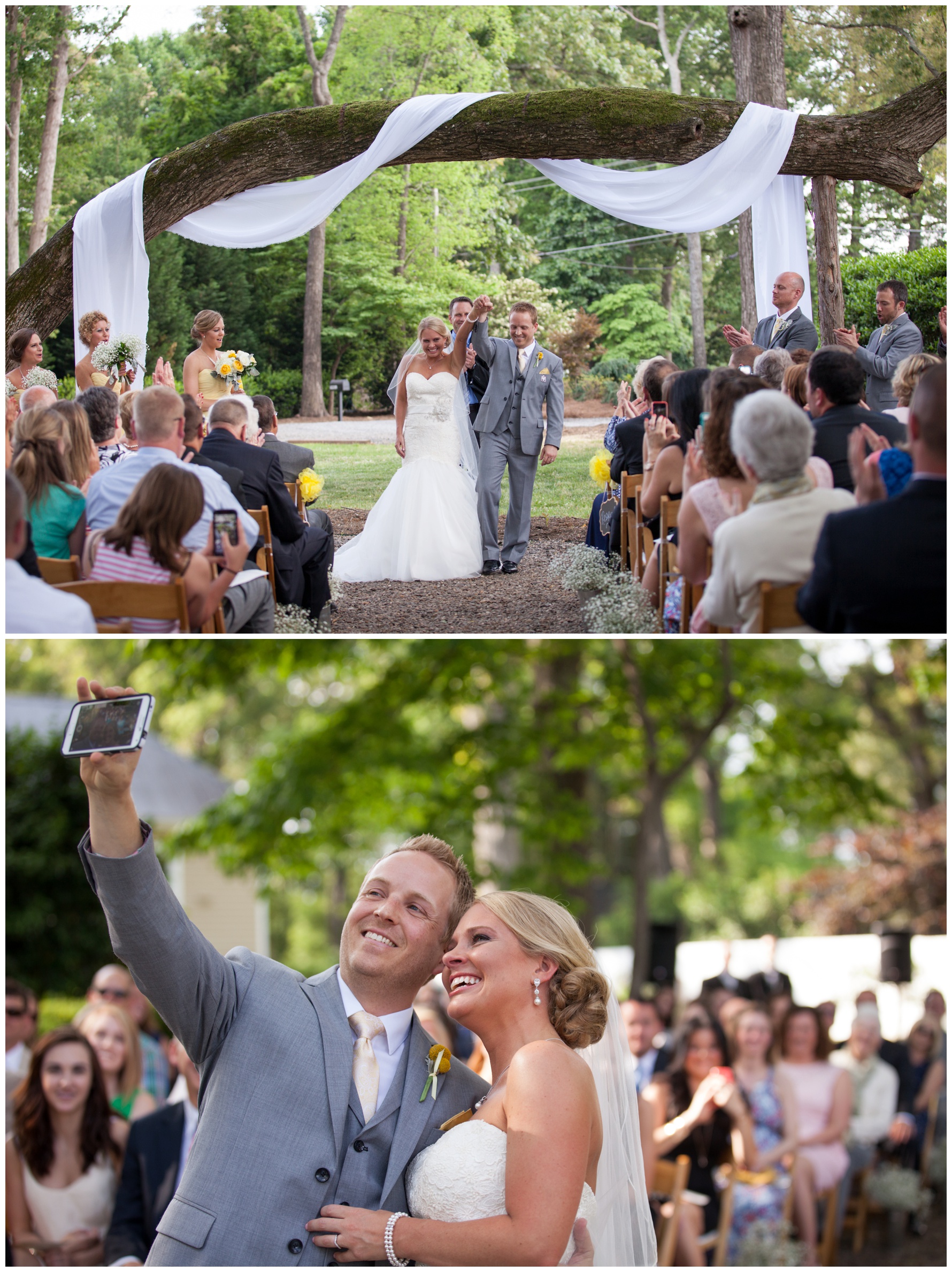 Their ceremony + reception took place at Whitehead Manor in Charlotte, NC. It was a perfect day for to be married…warm, but not unbearable. The sun shined through the trees onto the ceremony and the white fabric draped over the trees was a stunning touch to a simple and magical spot.