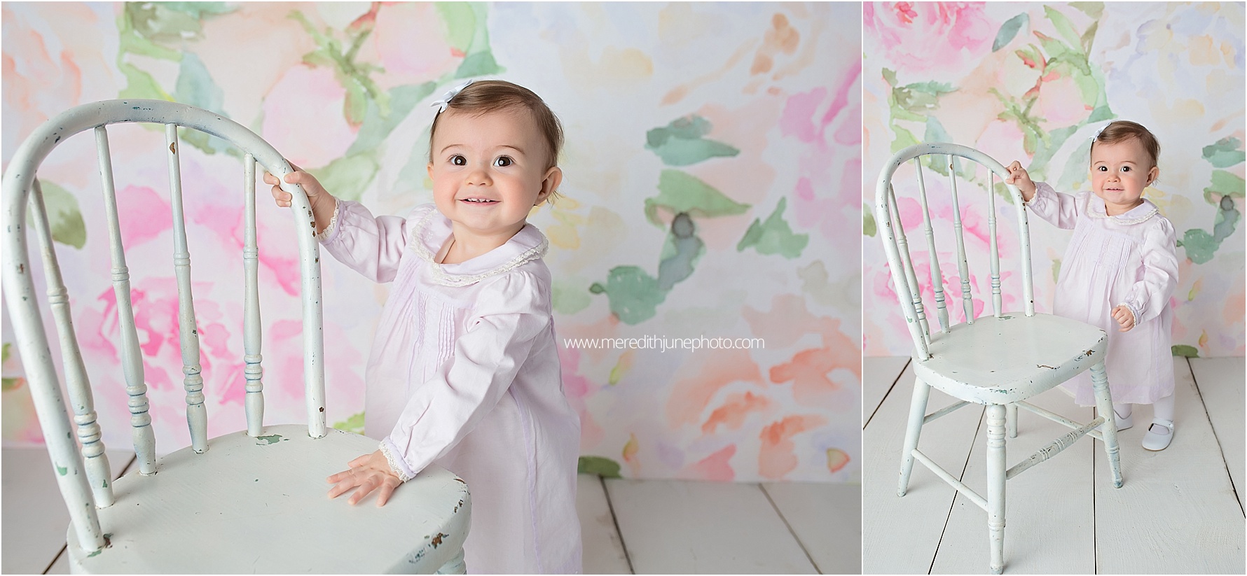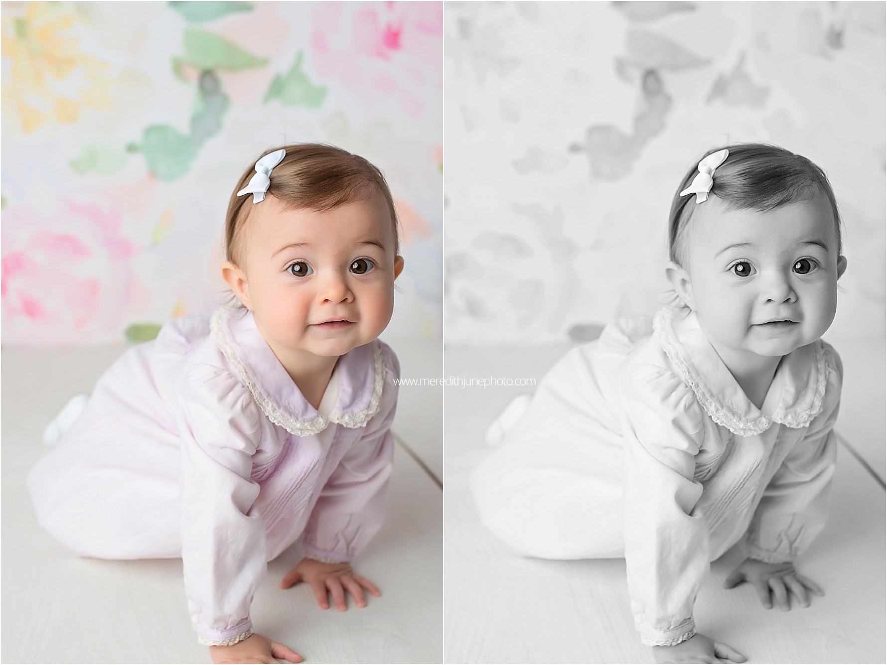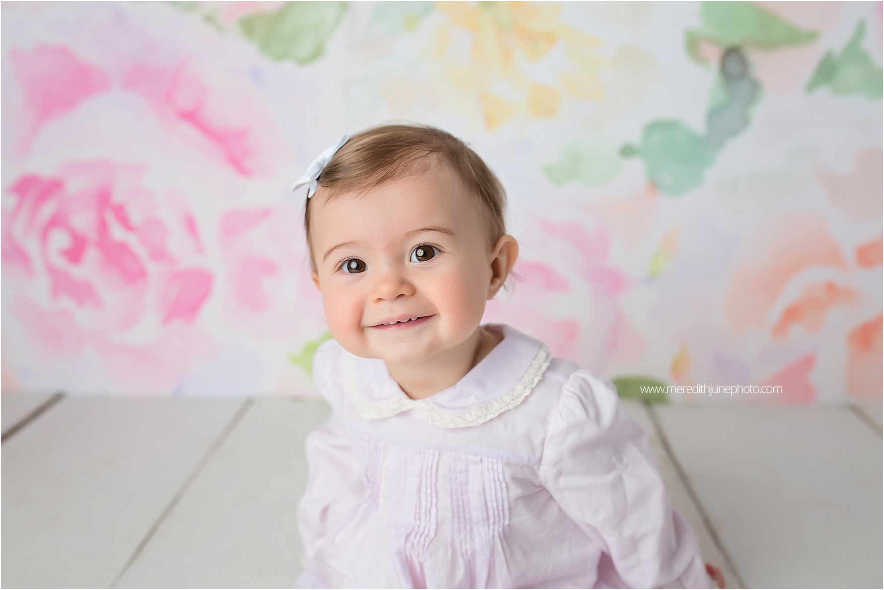 You know what I like? SIMPLE…SWEET…BABY FOCUSED! I know we can all get caught up in the biggest and the best, but I genuinely feel that baby focused images are timeless. I love the pops of color that we were able to use with the beautiful floral backdrop for this sweet baby’s portraits, but how about that cake smash set up? How sweet, right? So dainty and girly. I love it!