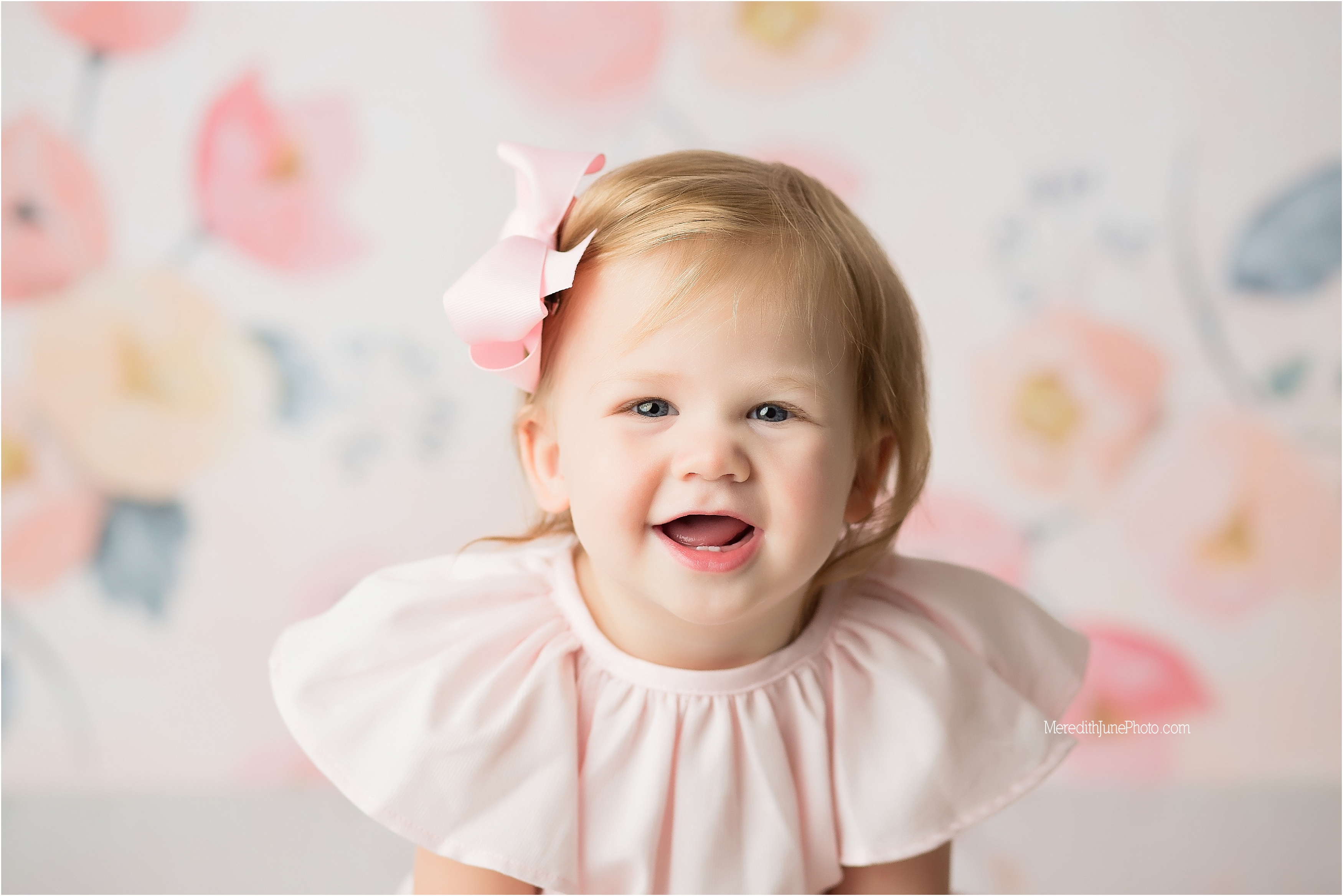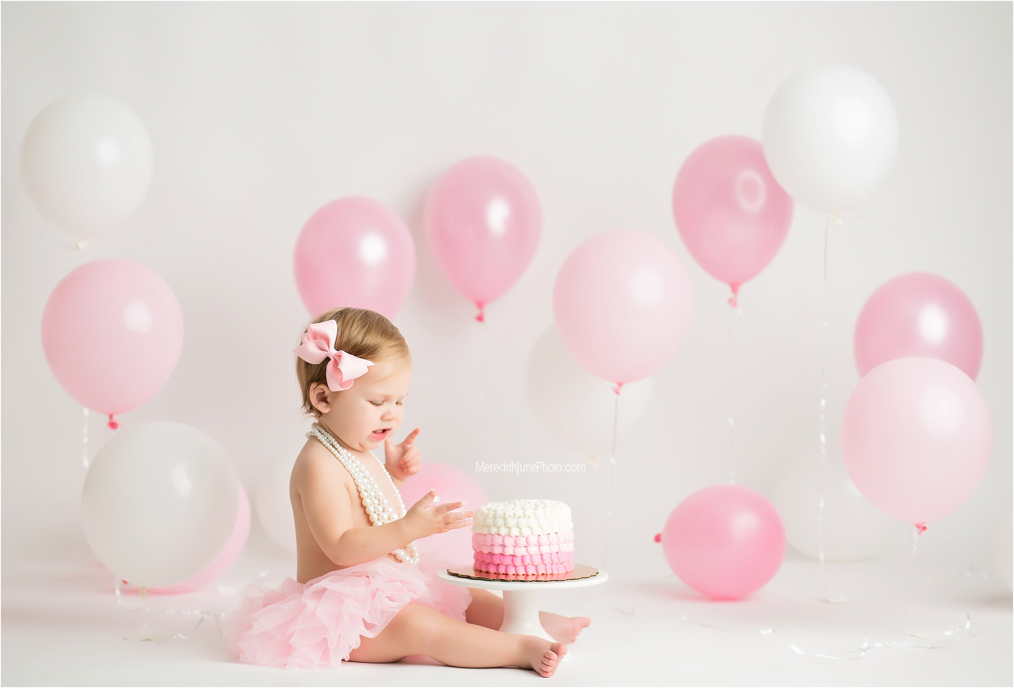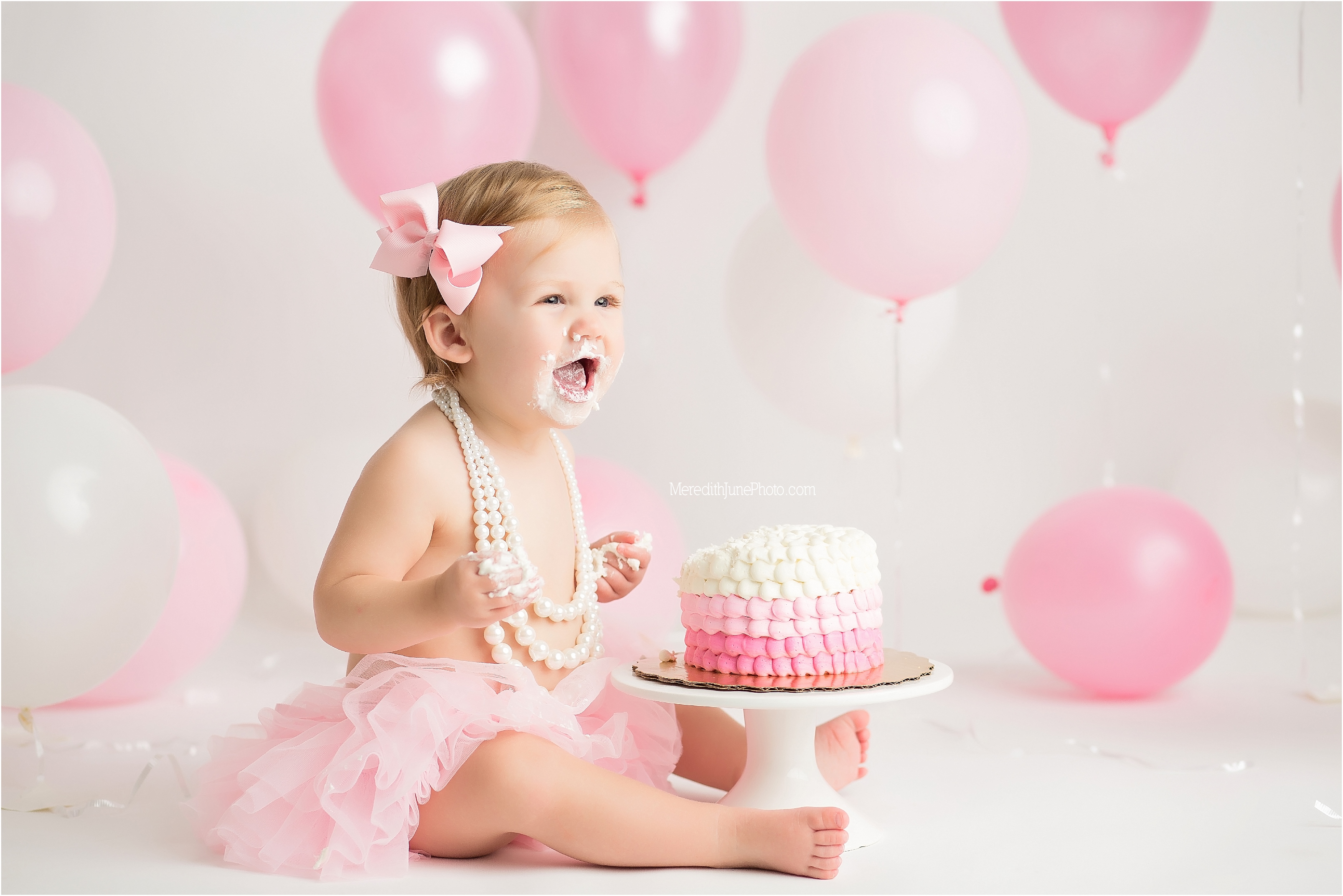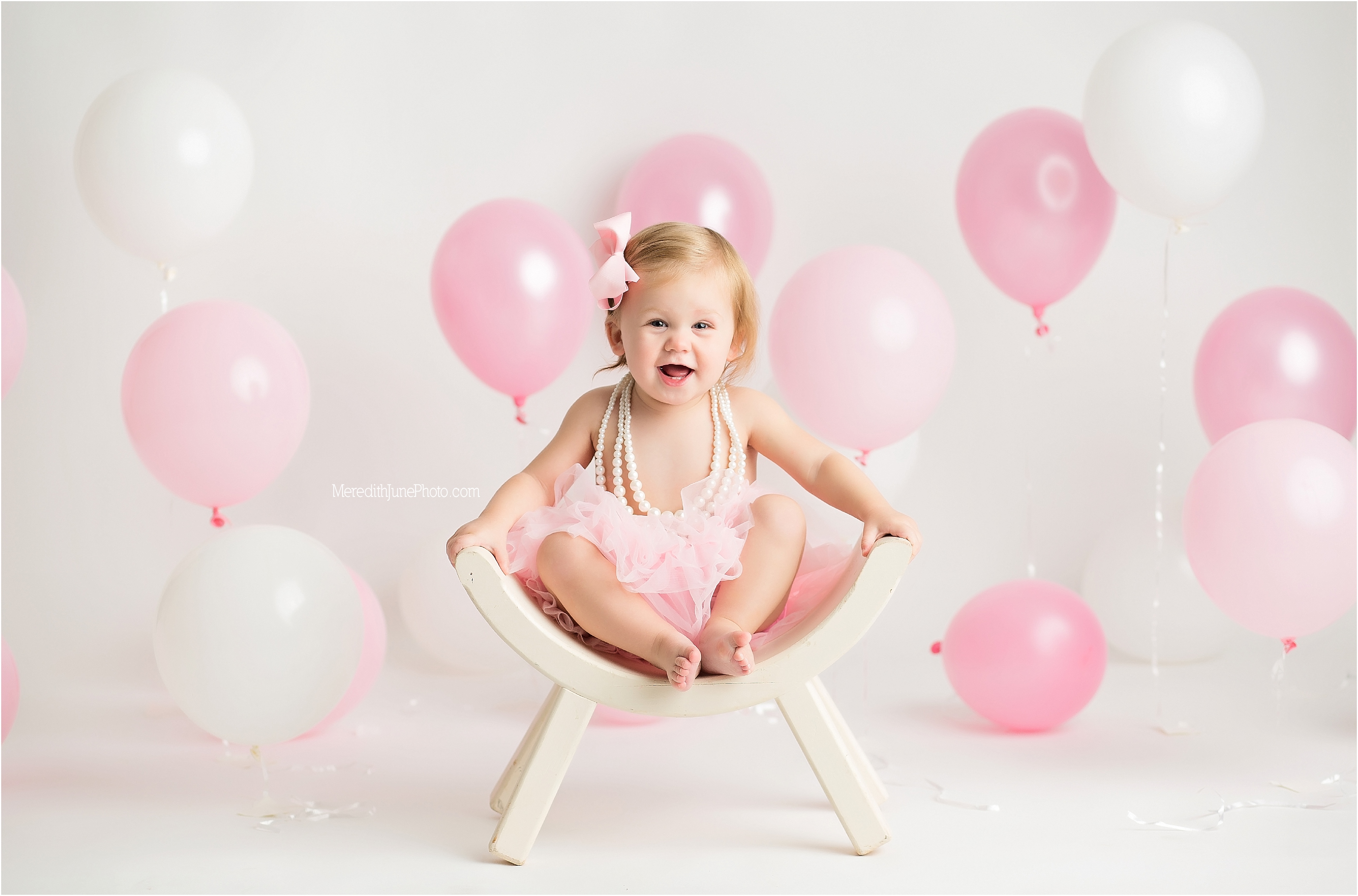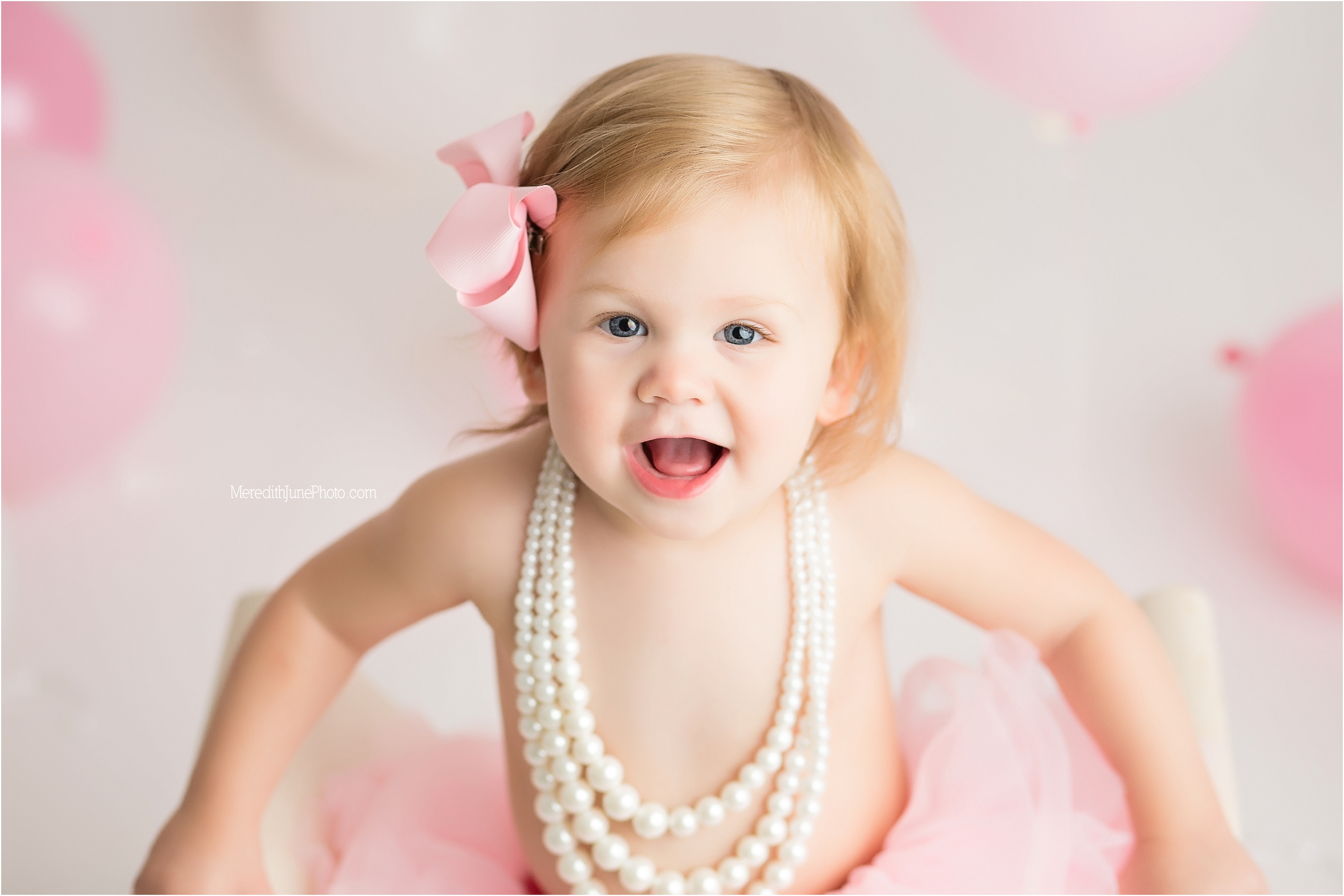 Little Hayden is one!! She was the happiest girl for her one year photo session and dove into her cake like a boss. Her beautiful portraits were soft pinks with little pops of yellow and blue and her cake smash set up was my favorite — balloons all over (12 floating for 12 months!) in pink and white. She wore pearls and a super cute pink tutu.