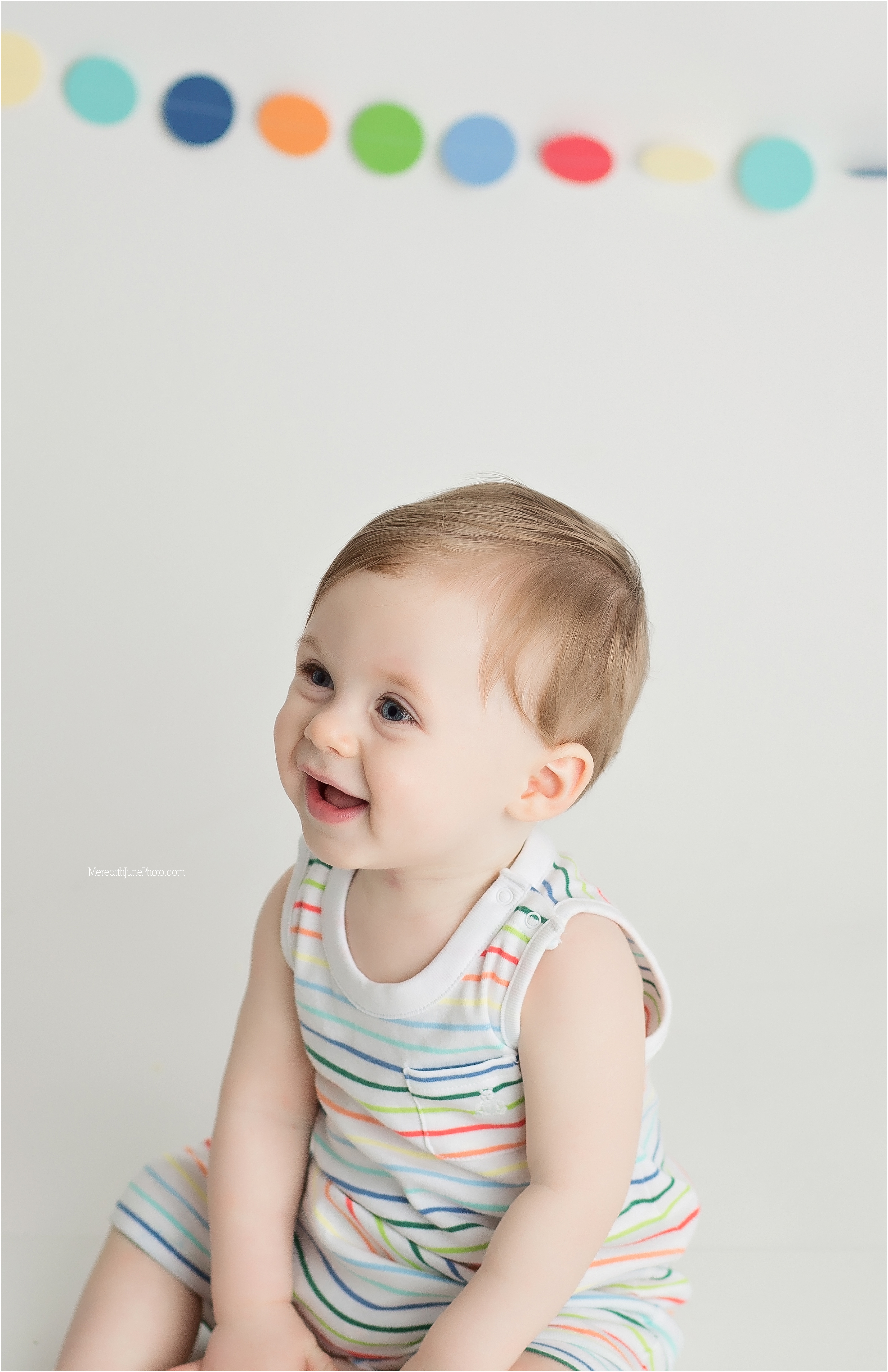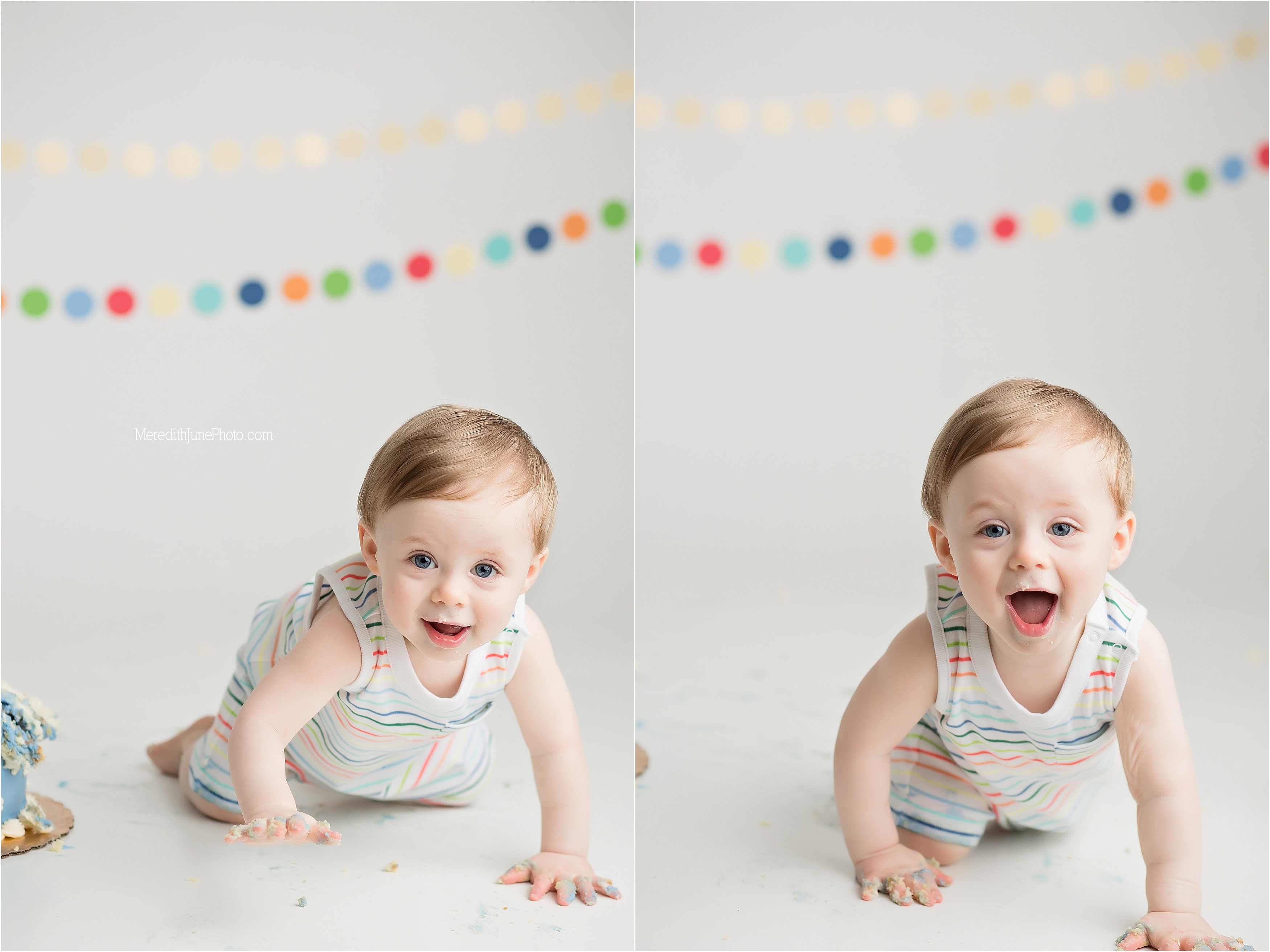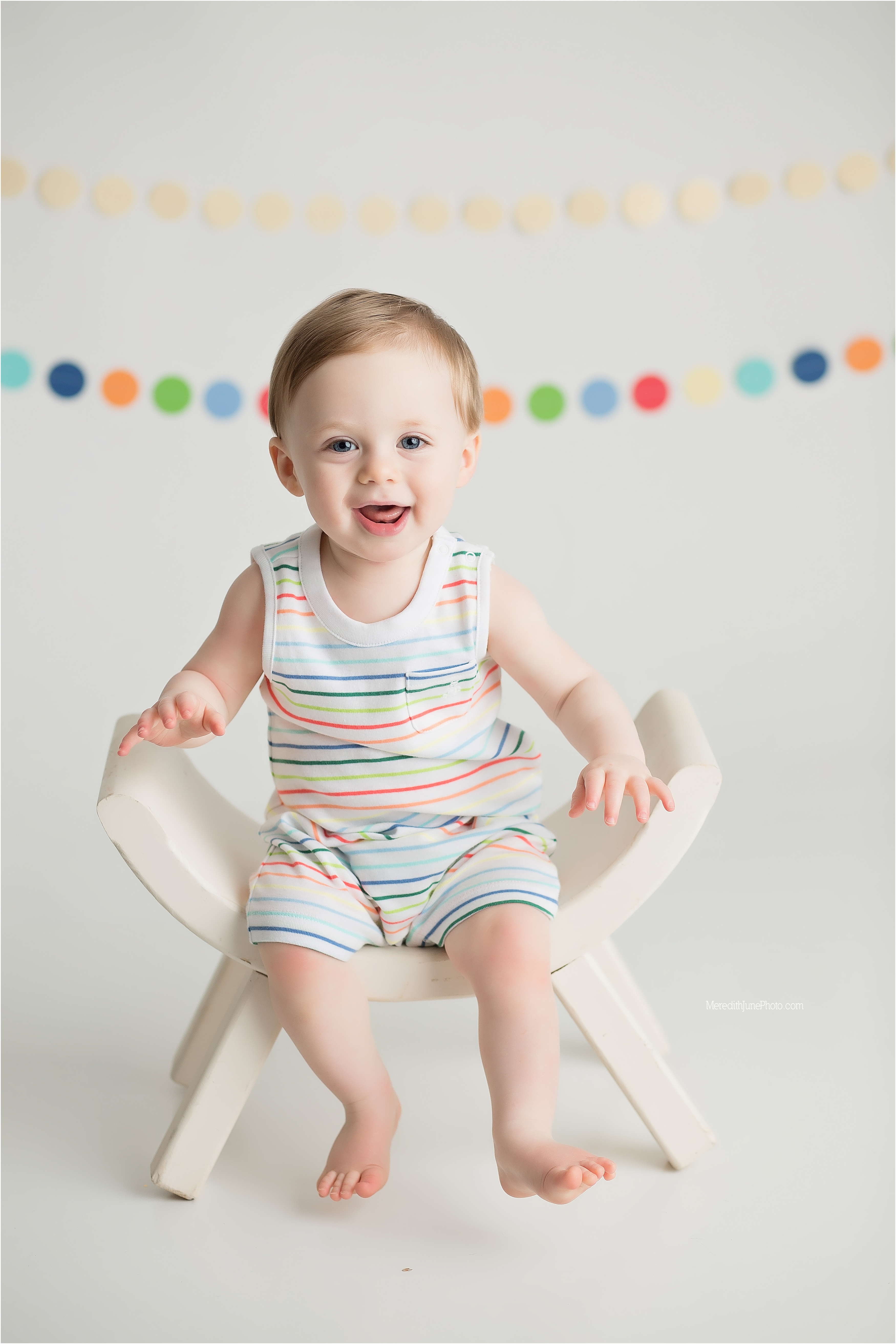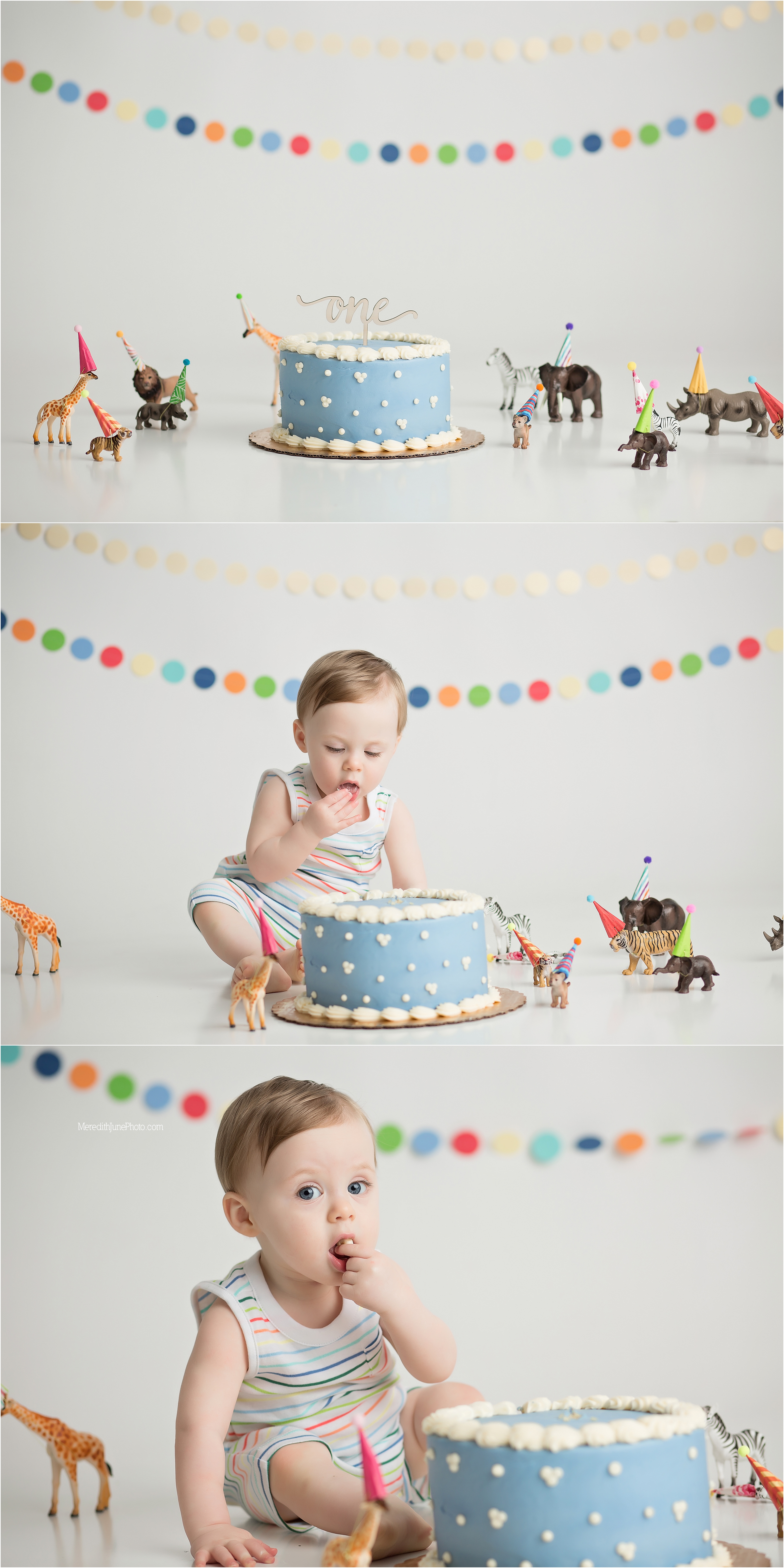 I absolutely adore how this photo session turned out because of the simplicity of the set up. The colorful dot banner gives a small pop of color and the toy animals give all the fun vibes, but the classic white background keeps the look timeless. I love the minimal, but effective back ground especially for a baby boy cake smash! One thing that I strive for with my photos is giving my clients a look that never goes out of style!