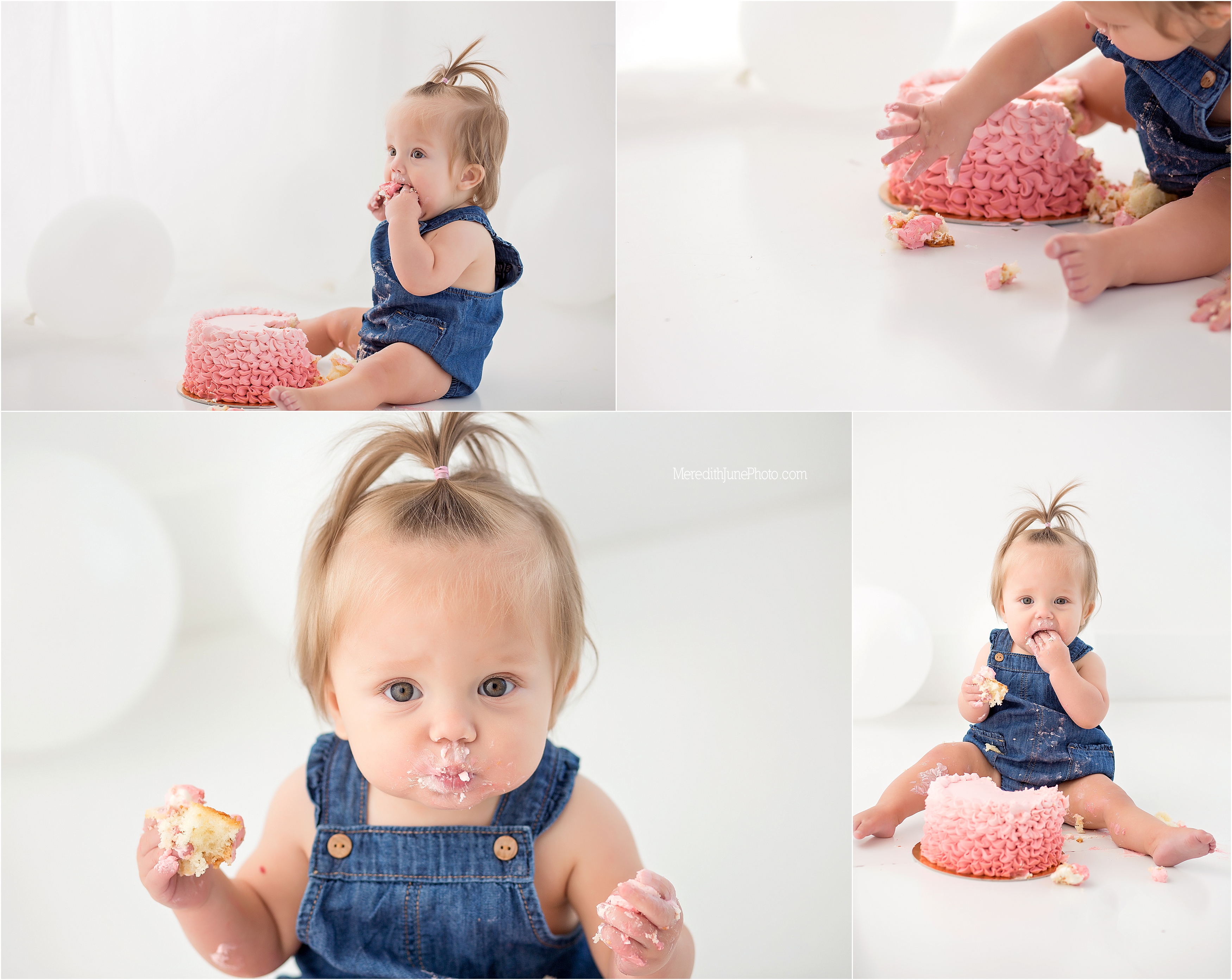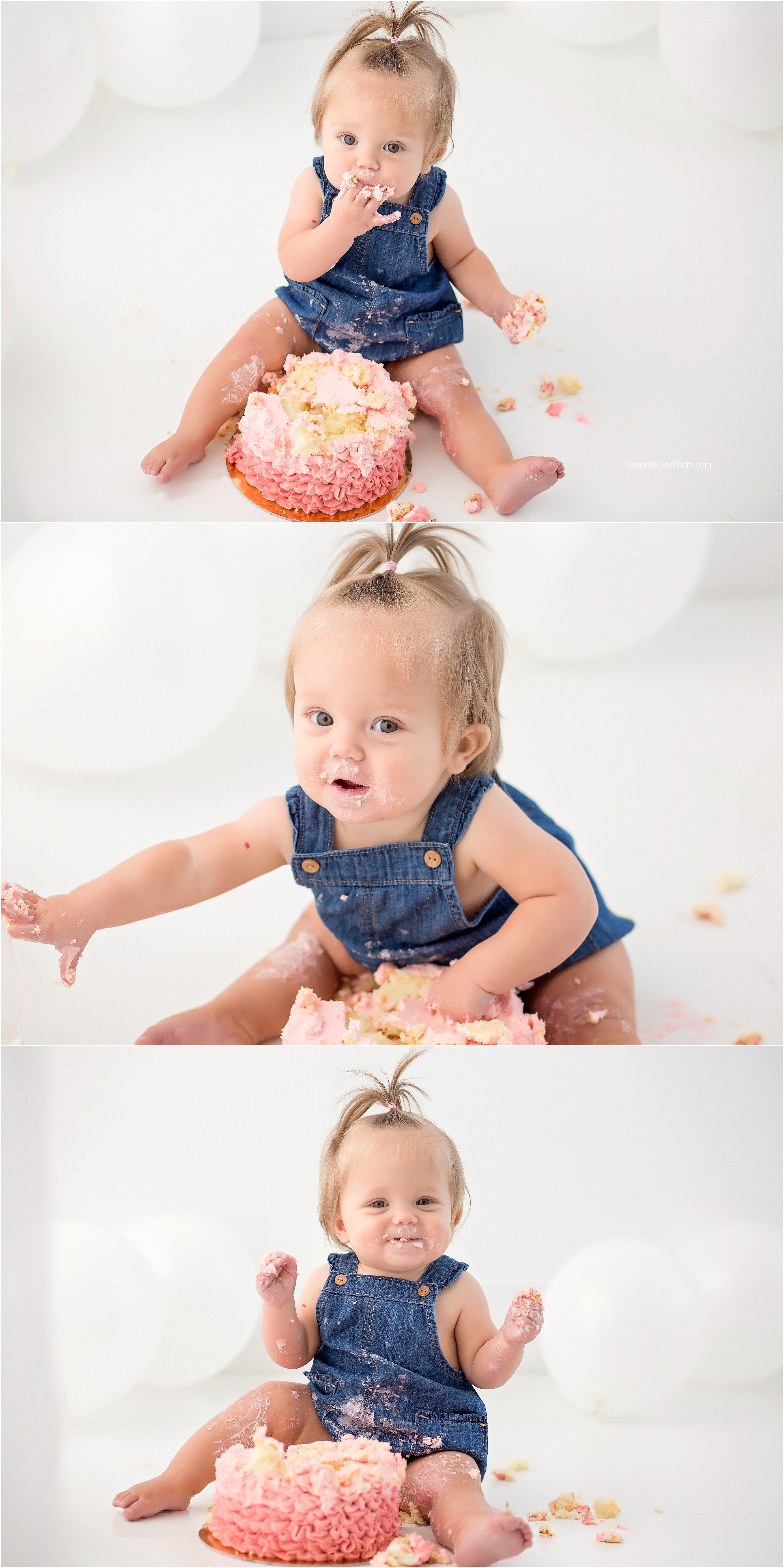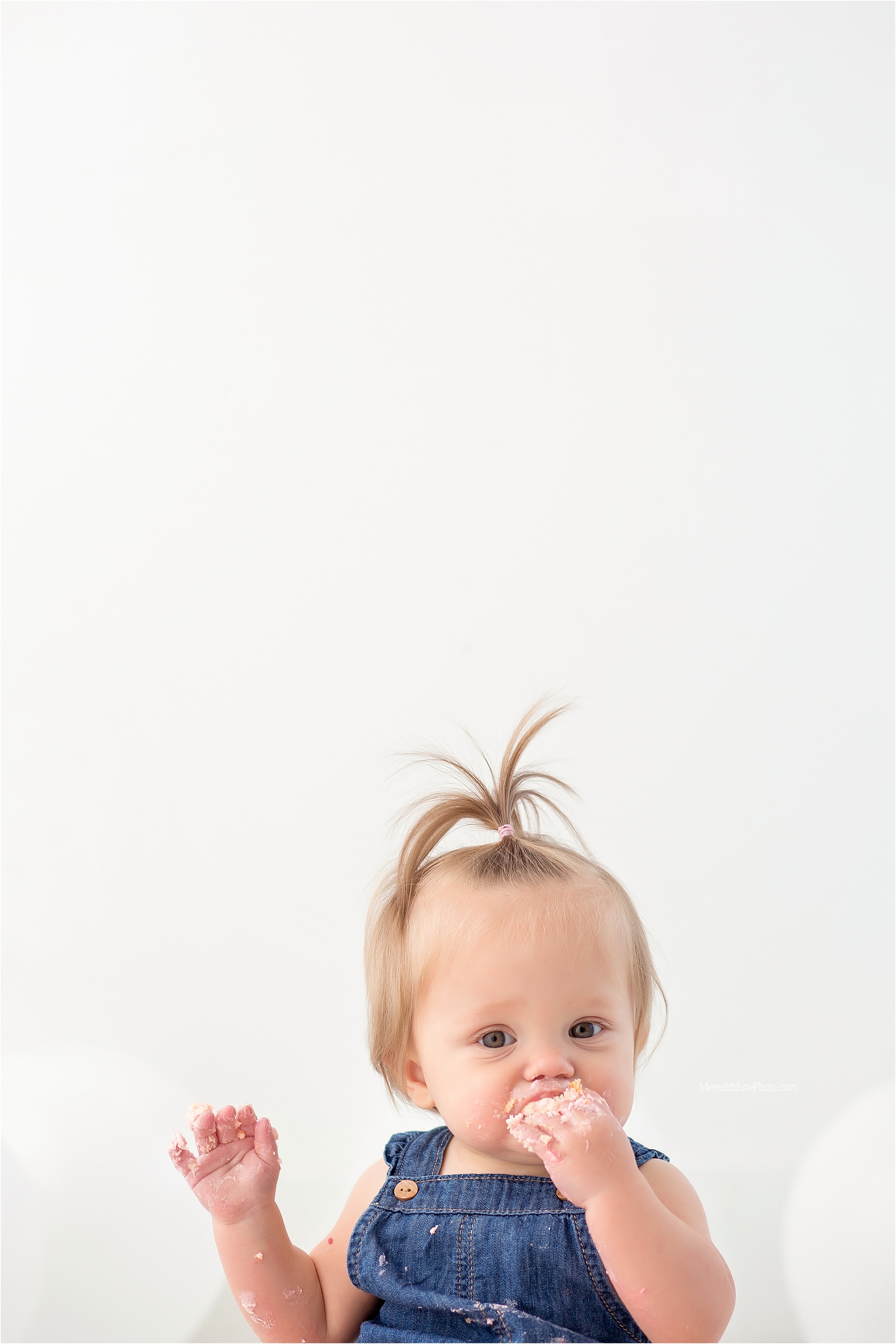 As always, I am in love with the all white cake smash set! But for some reason I love it even more with Annie’s overalls and pink cake. These three things turned out to be such a great combination for her photo session! Most baby’s are only interested in their cakes for 5 to 10 minutes, but miss Annie did quite the opposite! She LOVED playing in her cake and was occupied for so long! This gave me a great opportunity to get so many adorable and hilarious cake smash shots!