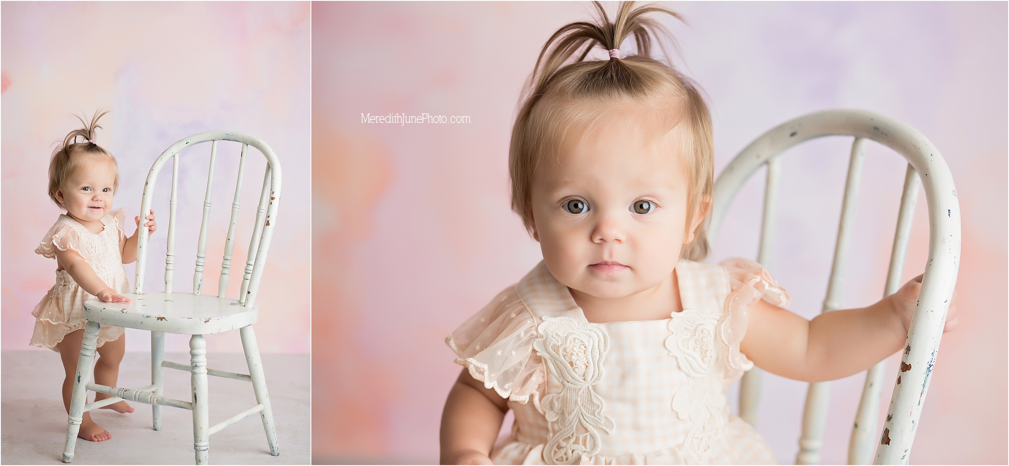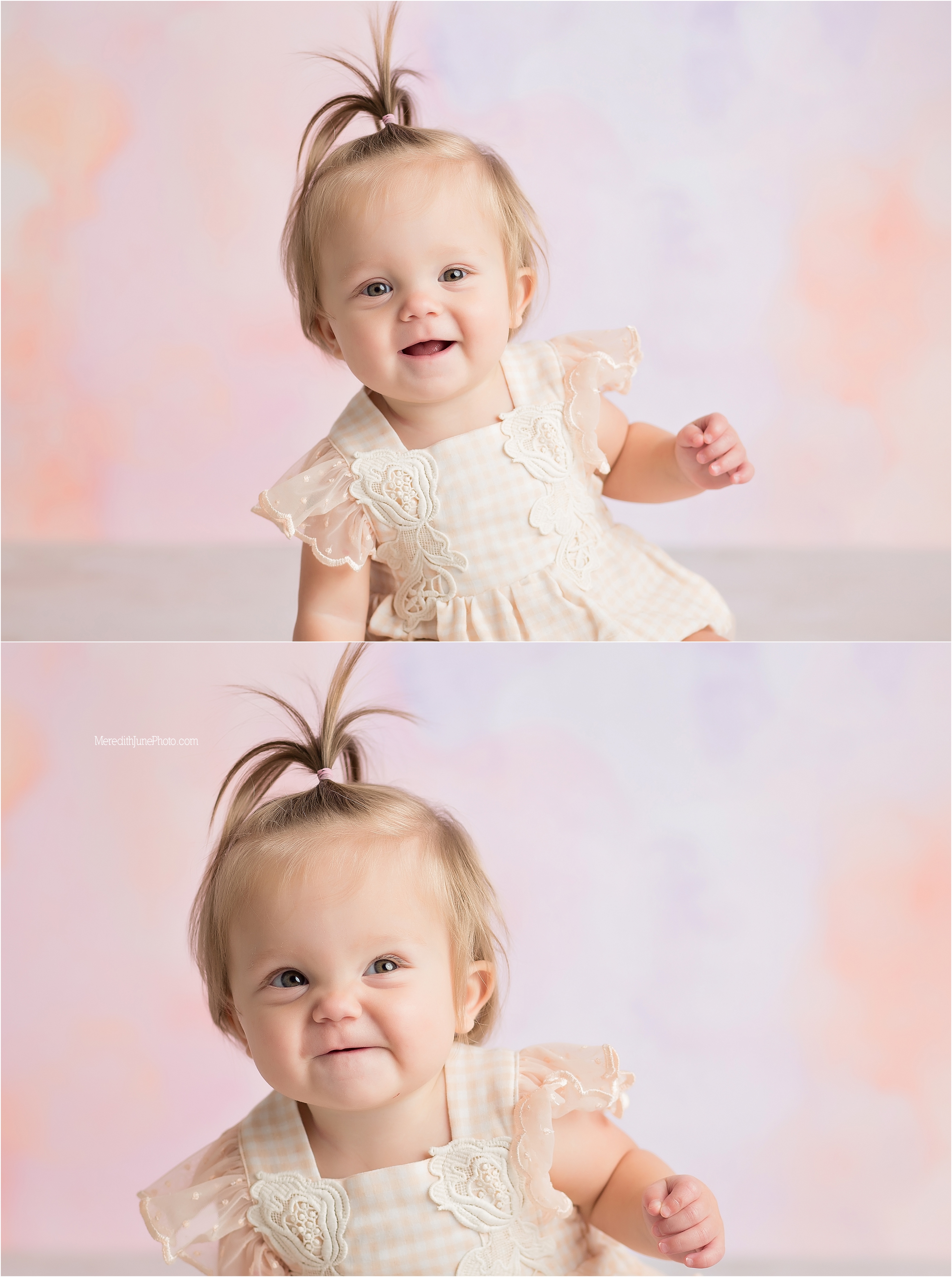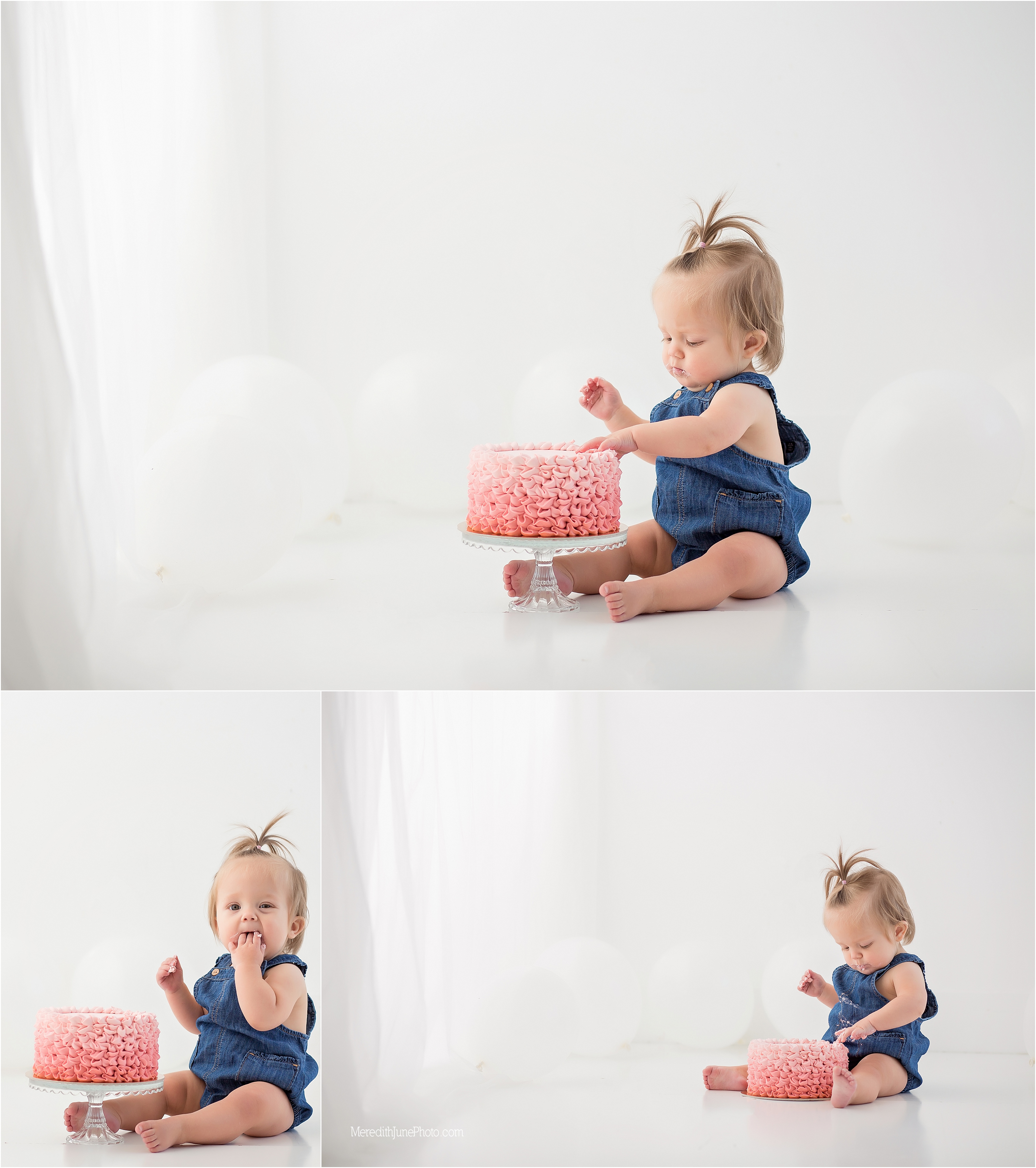 As always, I am in love with the all white cake smash set! But for some reason I love it even more with Annie’s overalls and pink cake. These three things turned out to be such a great combination for her photo session! Most baby’s are only interested in their cakes for 5 to 10 minutes, but miss Annie did quite the opposite! She LOVED playing in her cake and was occupied for so long! This gave me a great opportunity to get so many adorable and hilarious cake smash shots!