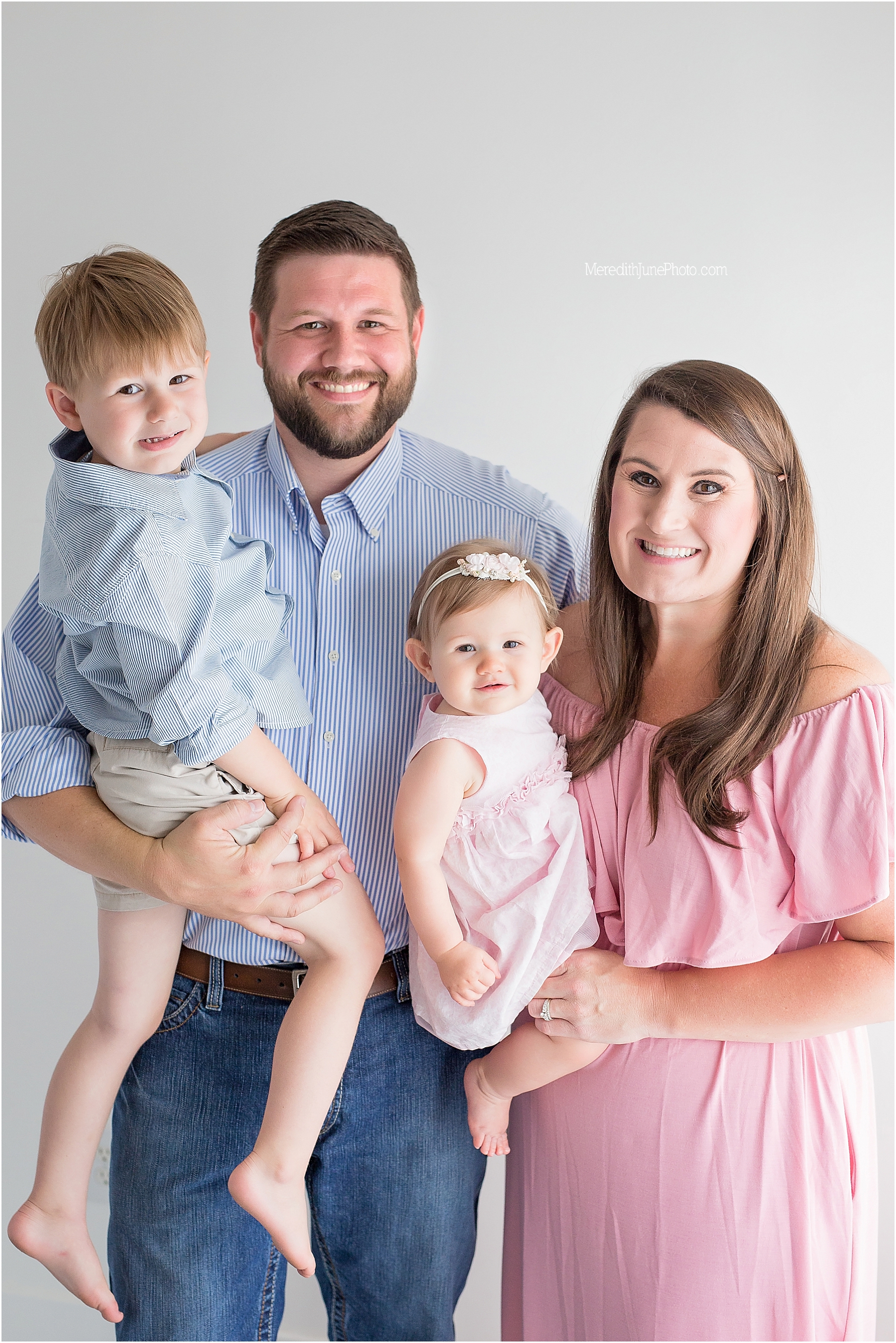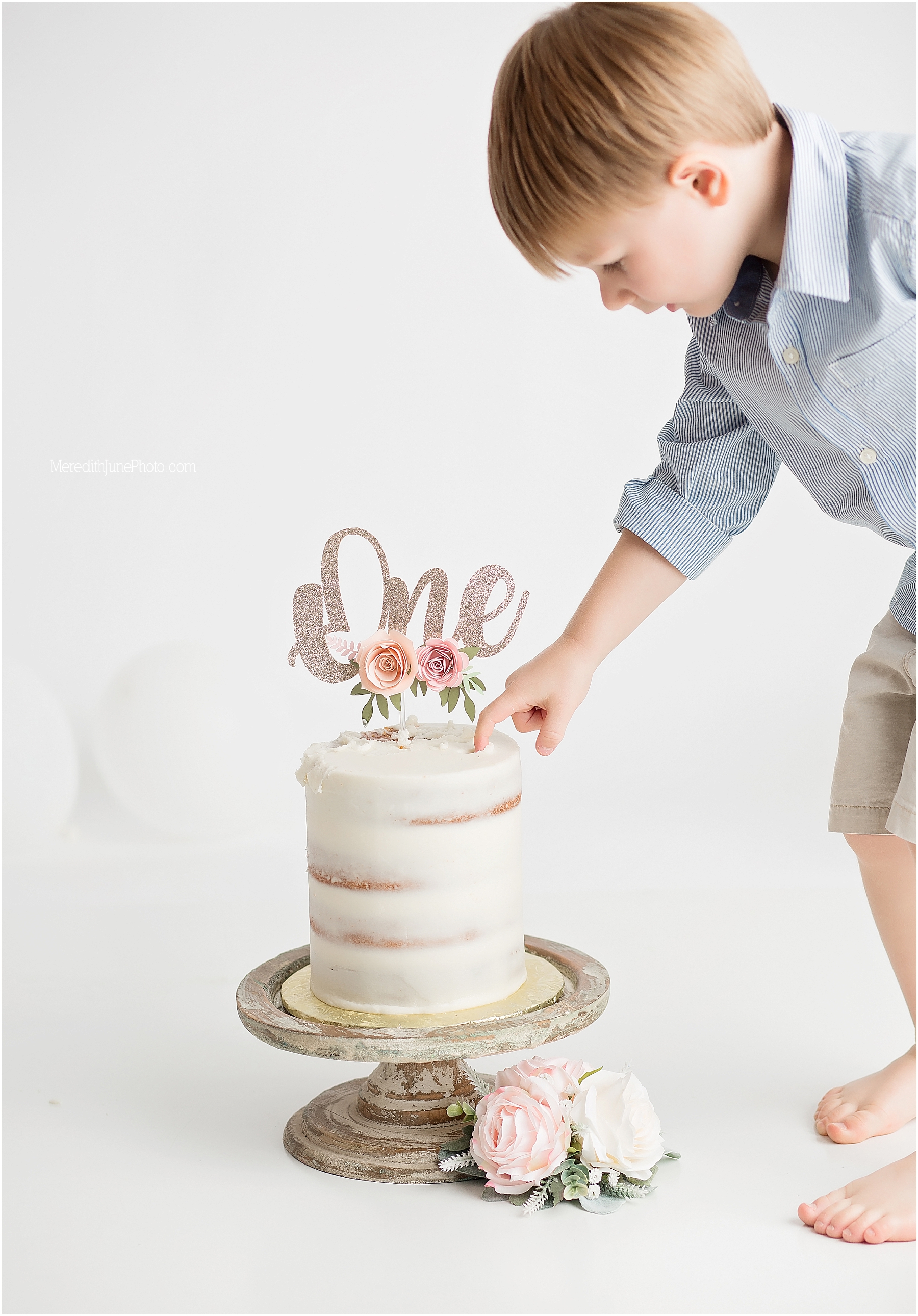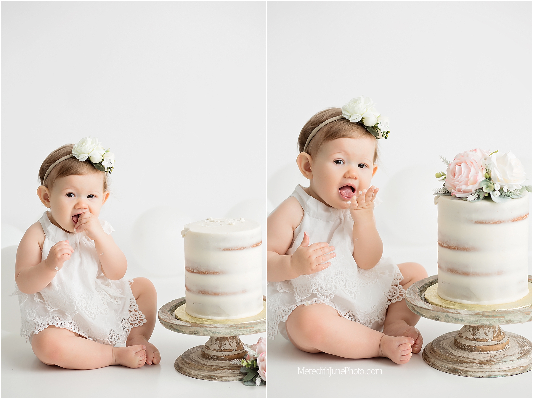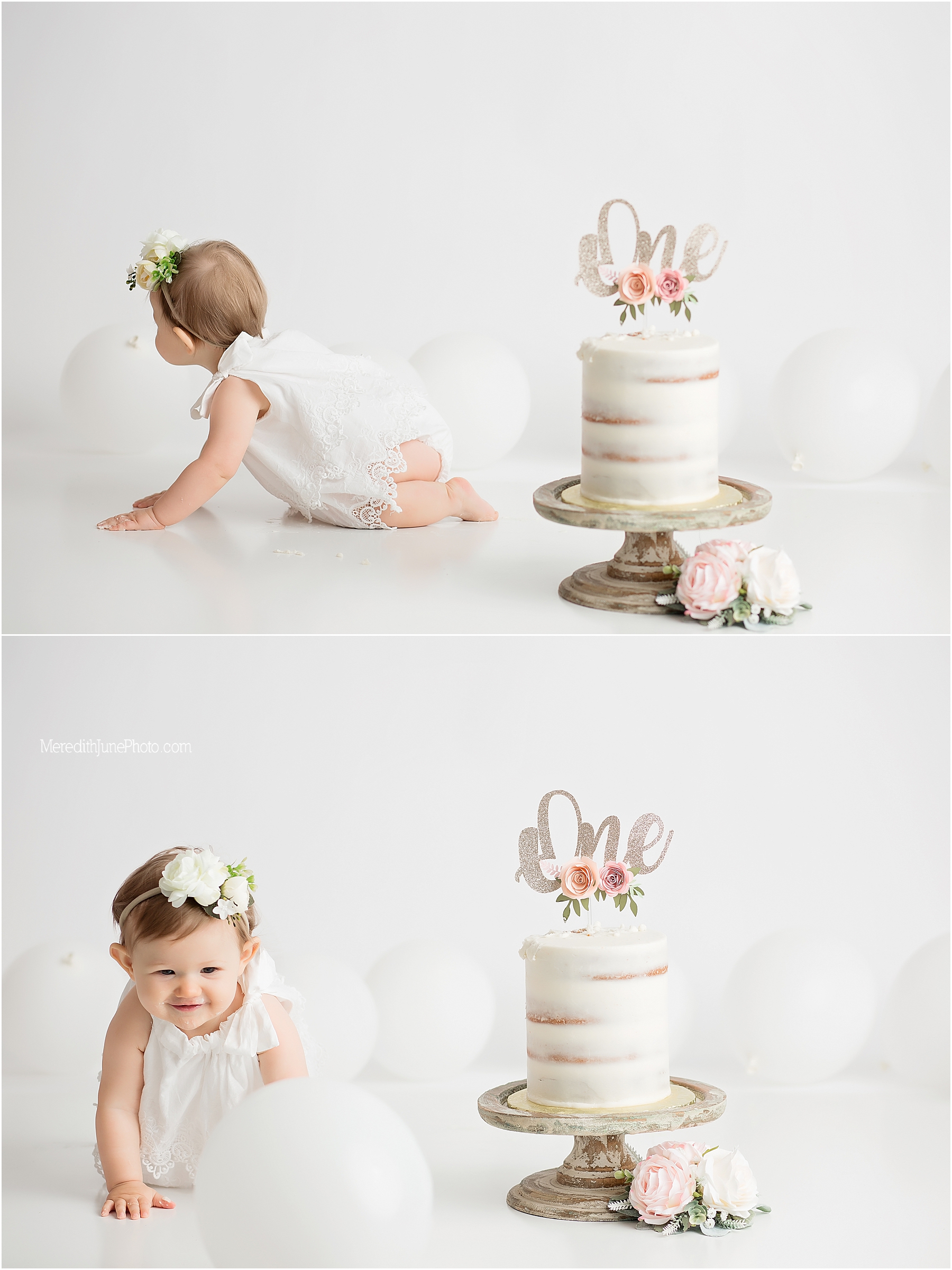 First of all, I am in love with the all white, simple cake smash set. It is so classic and stunning for a baby girl, or boy! Once Raleigh and her family arrived to my studio we started with photos of everyone! I had them all snuggle up on my couch while I grabbed a few pictures and then I set them up in my white space for a more casual look! Once I finished with those, I took a few shots of her Raleigh and her big brother and then solo shots of just her big bro. He was so sweet and gentle with Raleigh! I have never met two happier kids! I finished out the session with posed portraits of Raleigh. We took a quick break to change her outfit and went straight into the cake smash portion. She was so gentle with her cake but loved tasting the icing off of her finger! We even got her big brother in there to help eat the cake! They are super sweet photos!