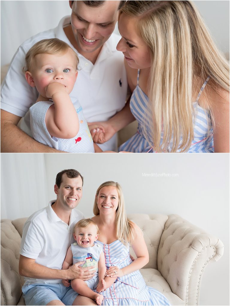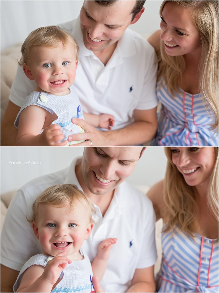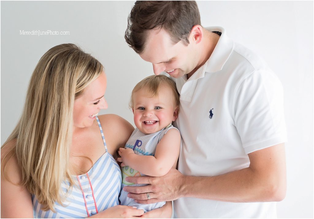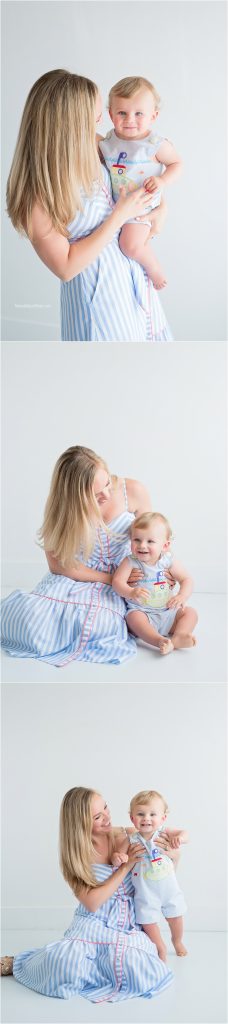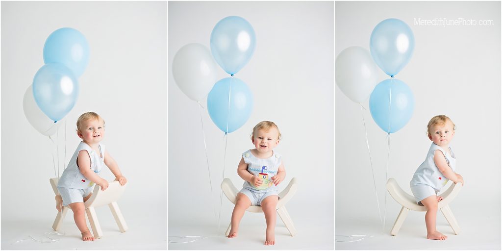 When baby boy Emerson arrived at my studio, he made himself right at home! He wasn’t the least bit shy and loved being in front of the camera. We started the session off with a few shots of him and his adorable parents! This really got him to smile and laugh, which helped me get these super sweet shots. After this, we got some solo photos of Emerson in my white space with minimal props and decorations. I love how these photos turned out! I think the light bright and airy baby blue theme is perfect for any little boys one year session!
