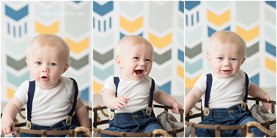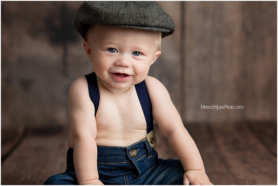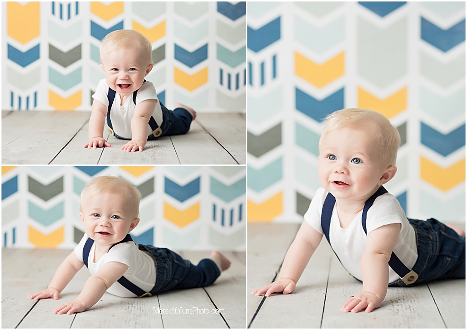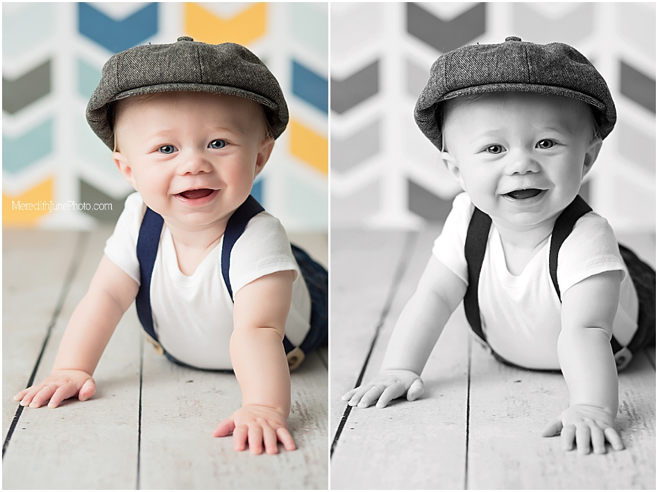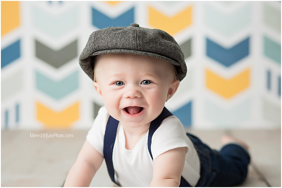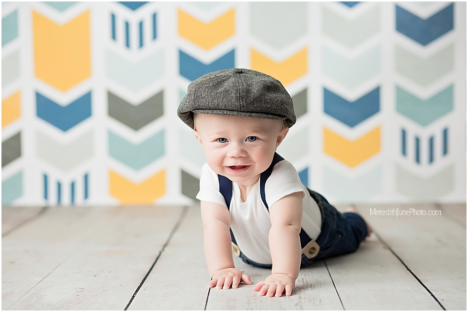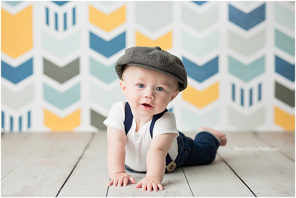 We chose a few of my favorite back drops for a baby boy for Thomas’ milestone sessions! We decided on a multi color chevron, a dark blue, and wooden panels. These add a lot of texture and variety to his gallery which I love! Mom wanted to keep it simple for the outfit, so we did a few shots with his shirt and hat on and few with them off! I am so pleased with how is gallery turned out. I hope you love it too!