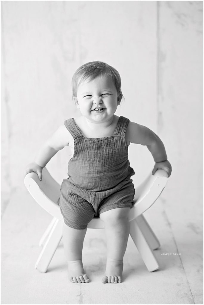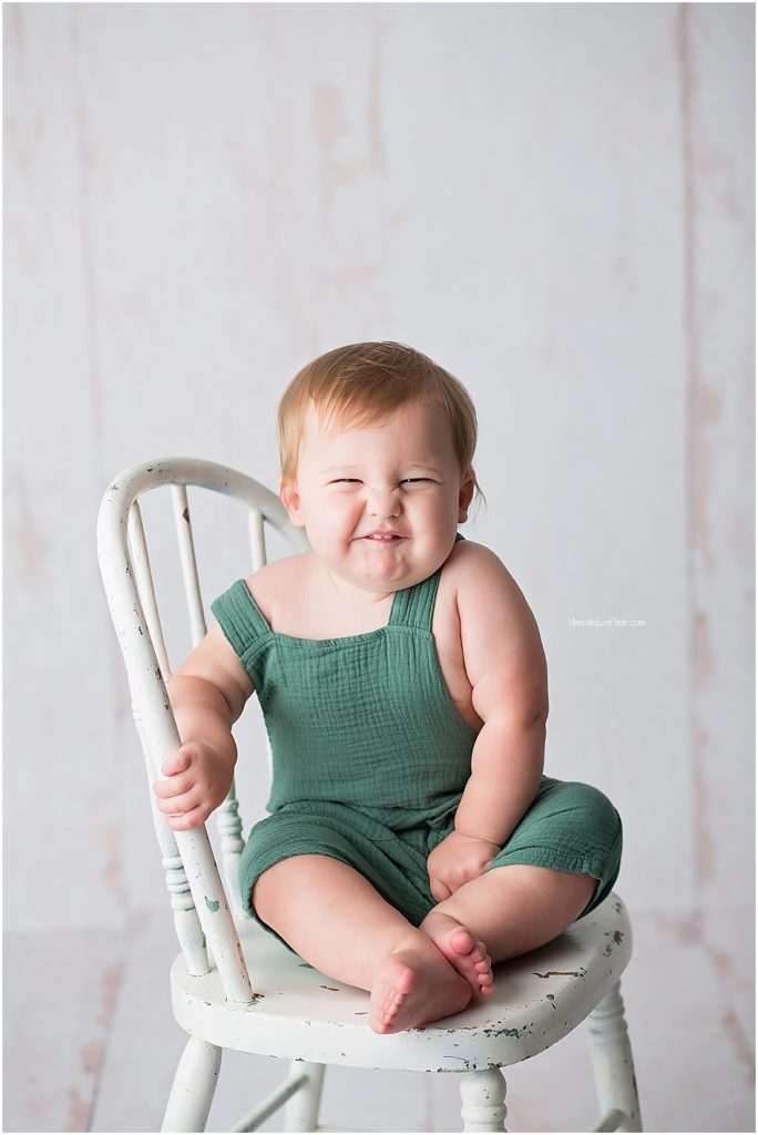 We started his cake smash with a few posed portraits in front of a white back drop. While we were here we used a few different props including my favorite antique chair and stool! Adding in props is such a fun way to grab the little ones reaction and allows me to capture a new side of their personality. Sometimes it helps babies feel more comfortable when they have something tangible to climb on, or make sounds with.