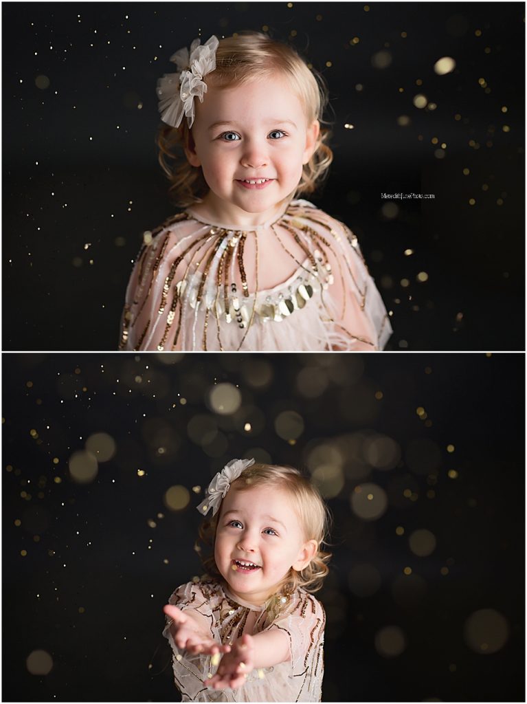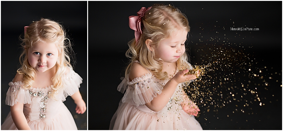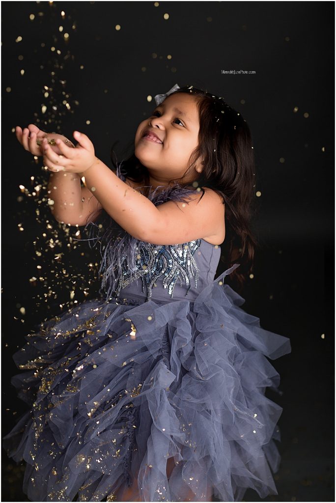 If you aren’t familiar with glitter minis then this is the blog post for you! I do glitter mini sessions every year in February. I only offer limited spots, so if you’re interested in them for next year, be sure to get on my calendar! During these sessions, my clients pose and play on a black back drop and are given endless amounts of gold glitter to toss around and twirl in. While the glitter sure is messy, it also makes beautiful and magical photos that every boy and girl dream of!