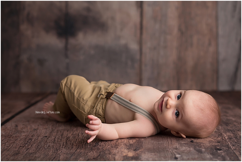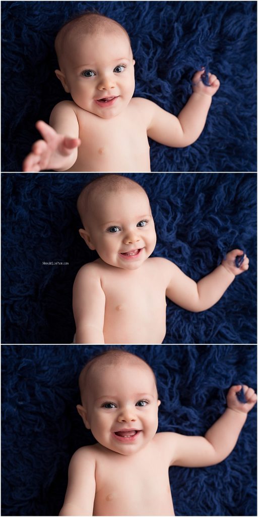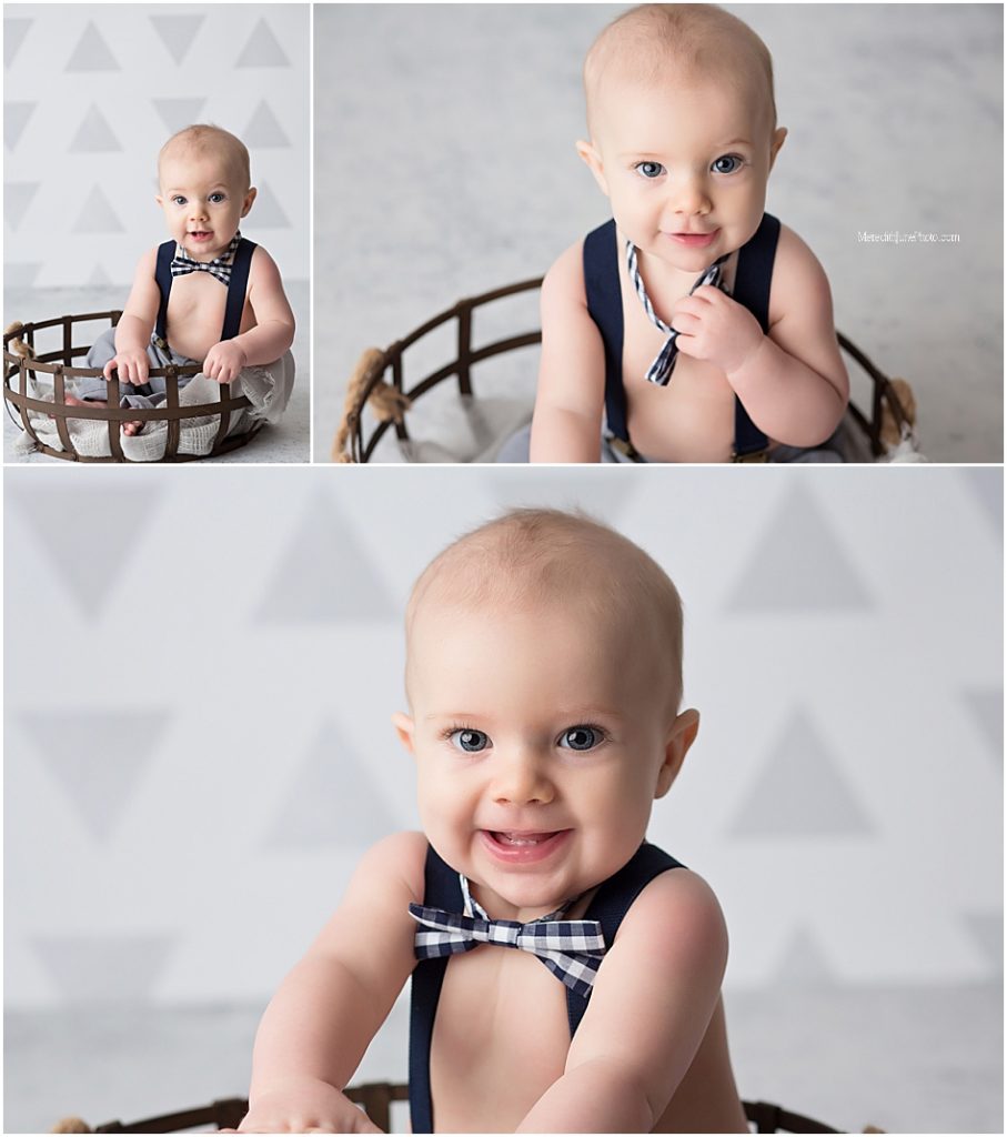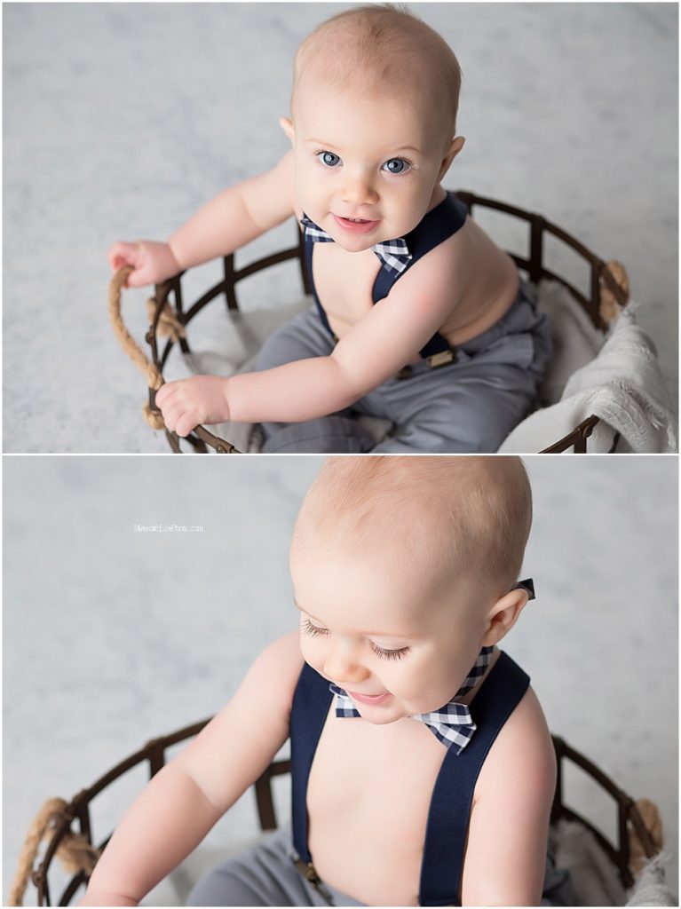 For this session we used three different back grounds. We used a gray and white pattern back drop, a navy blue fur, and wooden panels. These are all perfect for any baby boy photo session! They are neutral, but have just enough color and texture to add some excitement to the gallery. I was able to use a brand new prop that I am absolutely in love with. It’s an open metal basket with rope handles and this little guy looked soooo cute in it! There is nothing cuter than a baby in a basket (;
