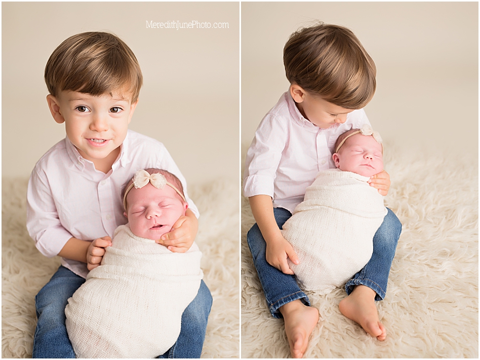 We started this session off with posed portraits of newborn baby girl Palmer! These pictures are so stunning. We stuck with classic colors for a baby girl session, white and pink! We also added in one of my favorite floral back drops to add some variety to her gallery! Once I was happy with these photos, we moved straight into sibling and family photos! Baby P posed so easily in the arms of her family. She completes them perfectly! Her big brother was SO sweet towards her and he also posed perfectly for me throughout the entire session.