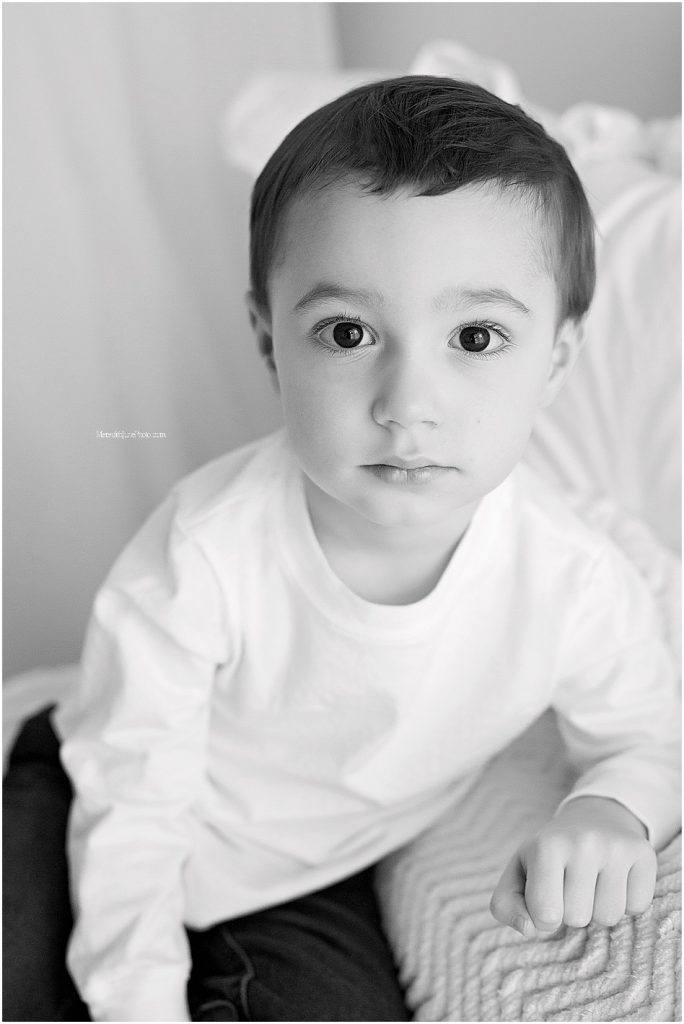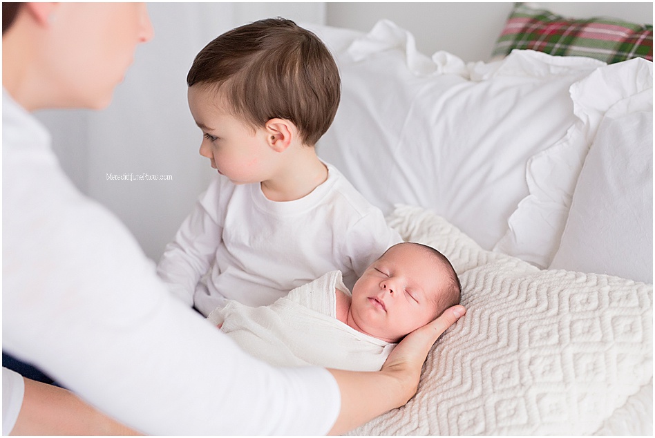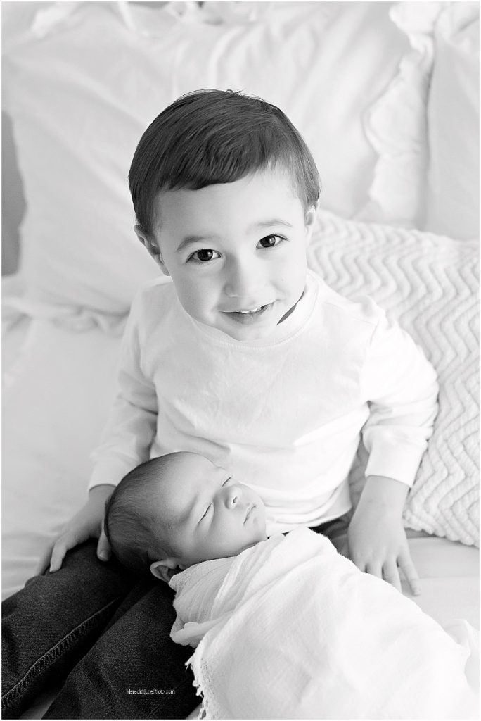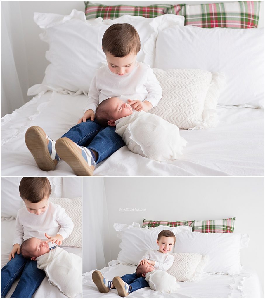 We started the session off with photos of just baby boy! We used an all white backdrop, a white paneled backdrop and a gorgeous nautical blue! I am loving how the blue compliments his skin tone and the simplicity of the all white photos. Once I was happy with his posed photos, we moved into sibling pictures! His big brother was so sweet and gentle throughout the session! We decided to change up the scenery a little bit and moved on over to my studio bed for sibling pictures! I love adding a little bit a variety to my clients galleries any chance I get!