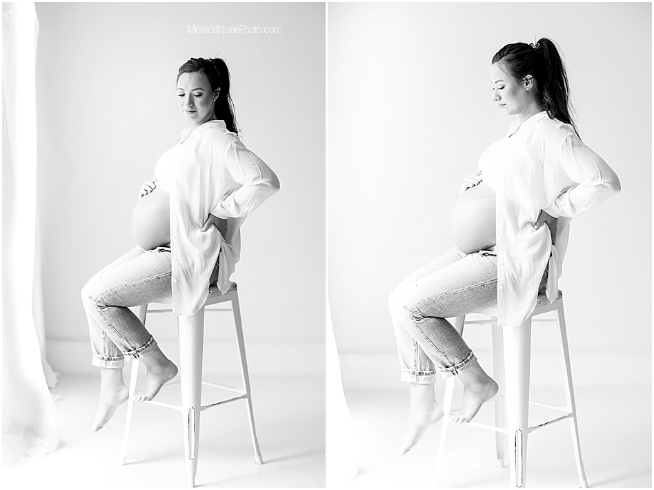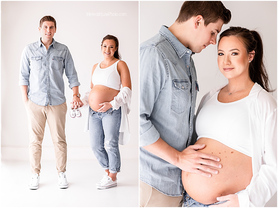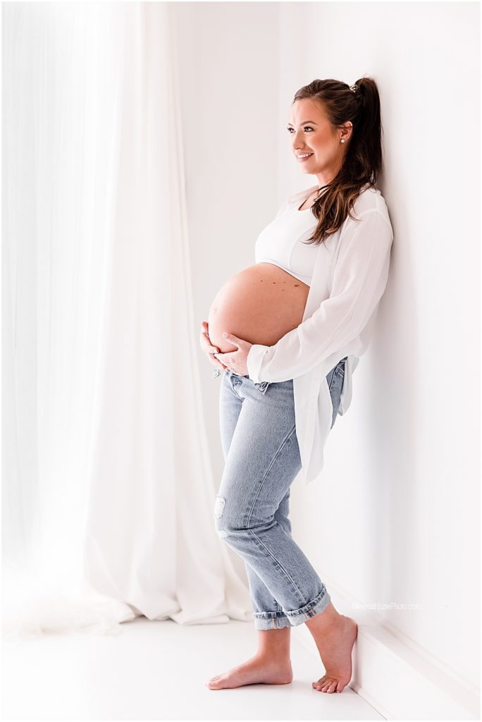 We started the session out with just photos of mom. She decided on a gorgeous lace-topped dress. She looked stunning in this slate color! If you love this dress, I have a similar dress in white. It is a fan favorite from the MJP Client Closet. To see more of what’s in the closet, head over to Instagram and search the hashtag #MJPclientcloset. Once we got the shots we wanted, she did a quick change into a different outfit. She wanted a chic and casual session. I am in love with the crop top, distressed jeans and white jacket look. I took a few shots of mommy with a few different props and then some couple shots. They all turned out to be gorgeous!