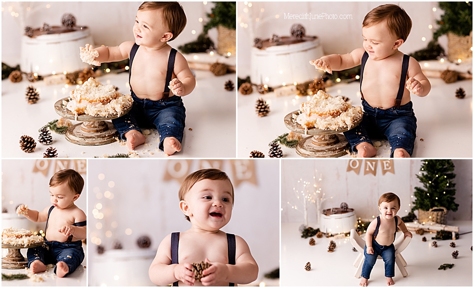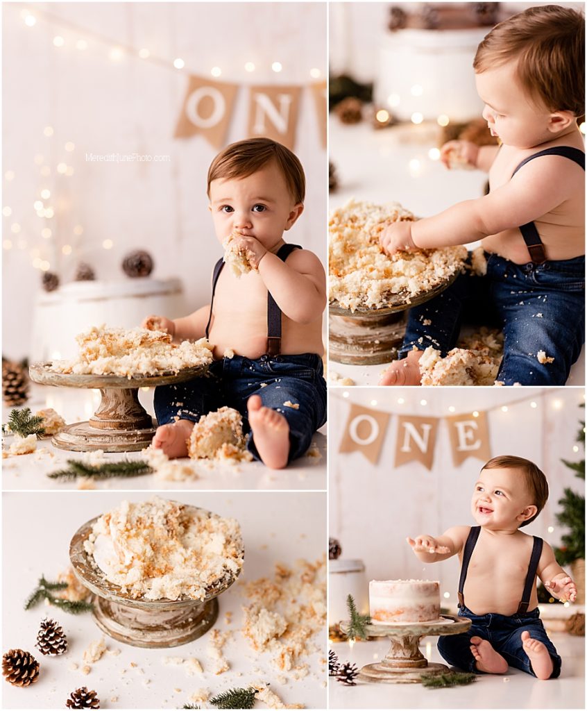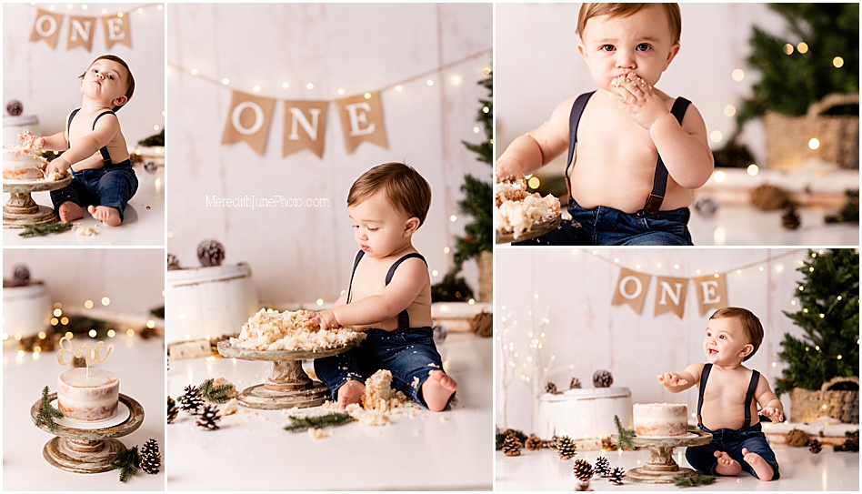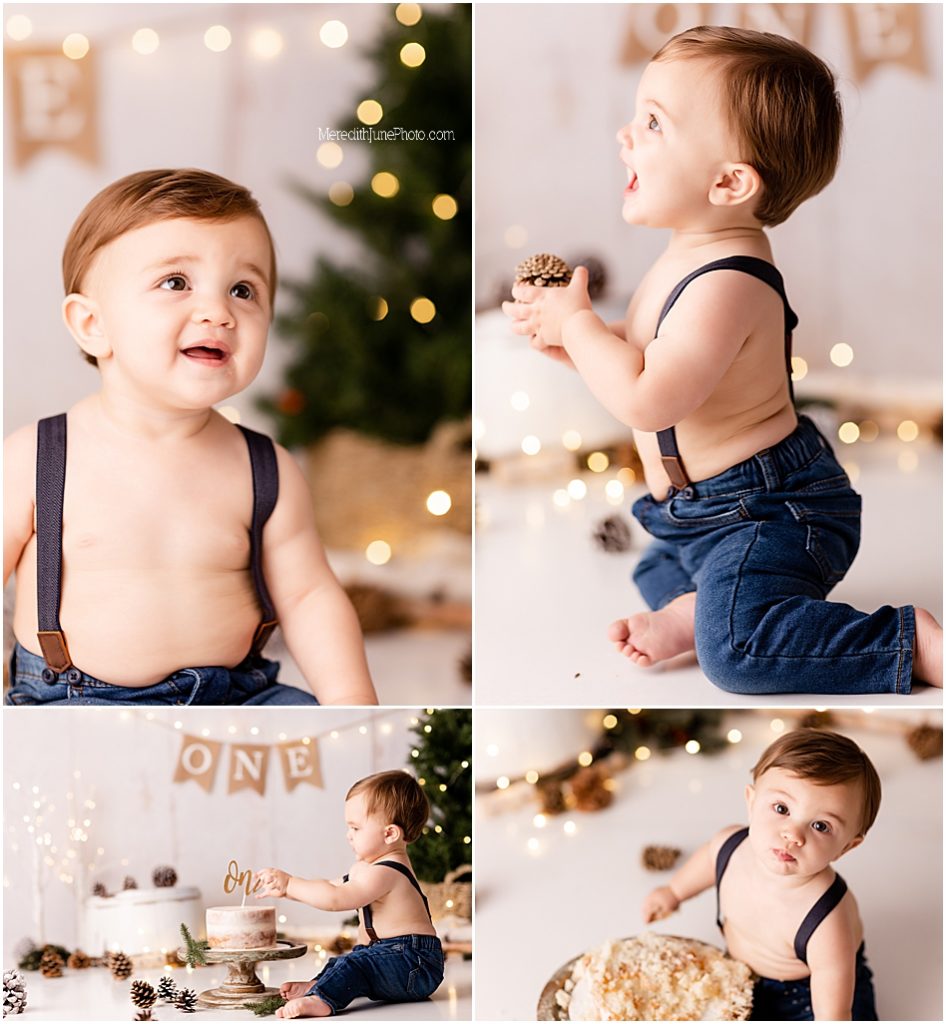 I’ve done a few winter ONE-derland cake smash session, but this is hand down my favorite set up! The Christmas lights make the session feel magical. I also love the added touch of pine cones and the Christmas tree. It give a rustic and boy-ish feeling while still keeping that bright and airy style of photography. I also really enjoy how we did a studio set up as well as outdoor photos. This gives the Scandone’s a beautiful variety of photos to choose from for their little one.