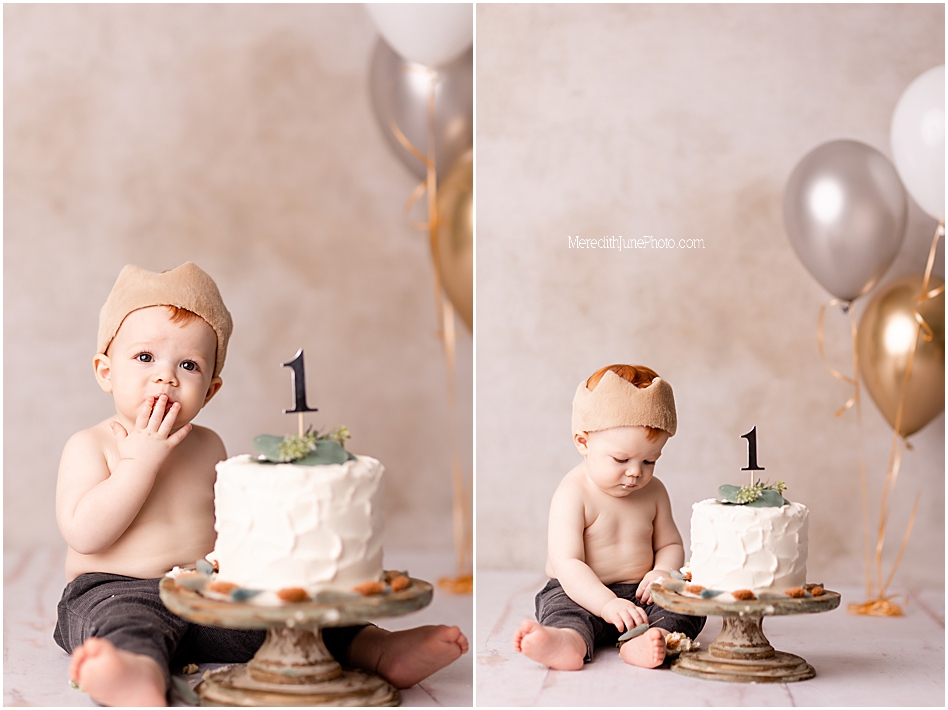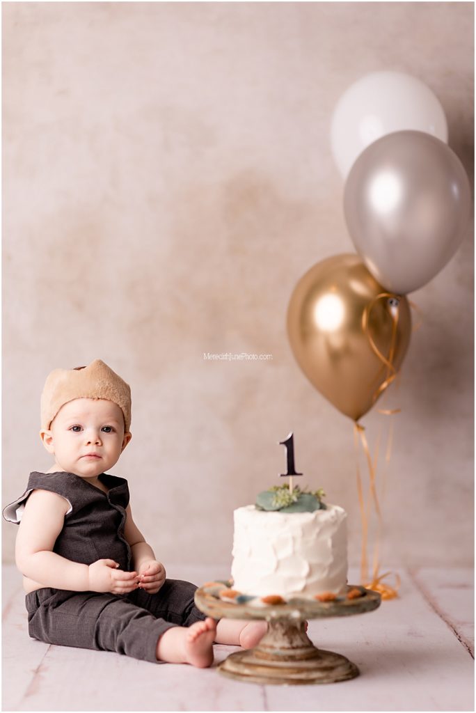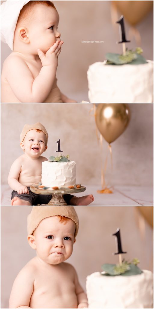 While mom and dad quickly changed Archi into his next outfit, I put the final touches on his cake smash set up. We changed gears a bit and used more earth tones for this portion. We kept everything neutral, but used warmer tones like neutral tans and greens. This is such a cute set up for a baby boy! Little Archi loved playing in his cake, but it took a little bit of bribing from mom and dad. It’s always so much fun to see each baby’s different reactions!