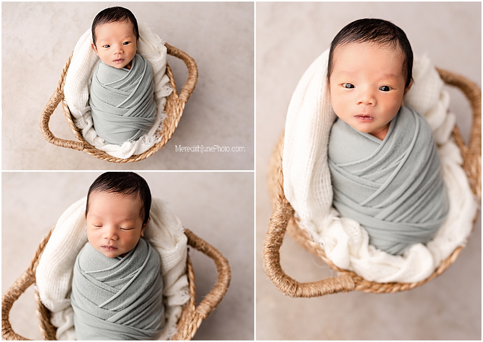 We finished the session up with a few newborn portraits of just the little guy. We did a few different looks, but one of my favorites is of him in the basket wrapped in the sage blanket. The earth tones looked gorgeous against his skin and he looked so so sweet all bundled up!